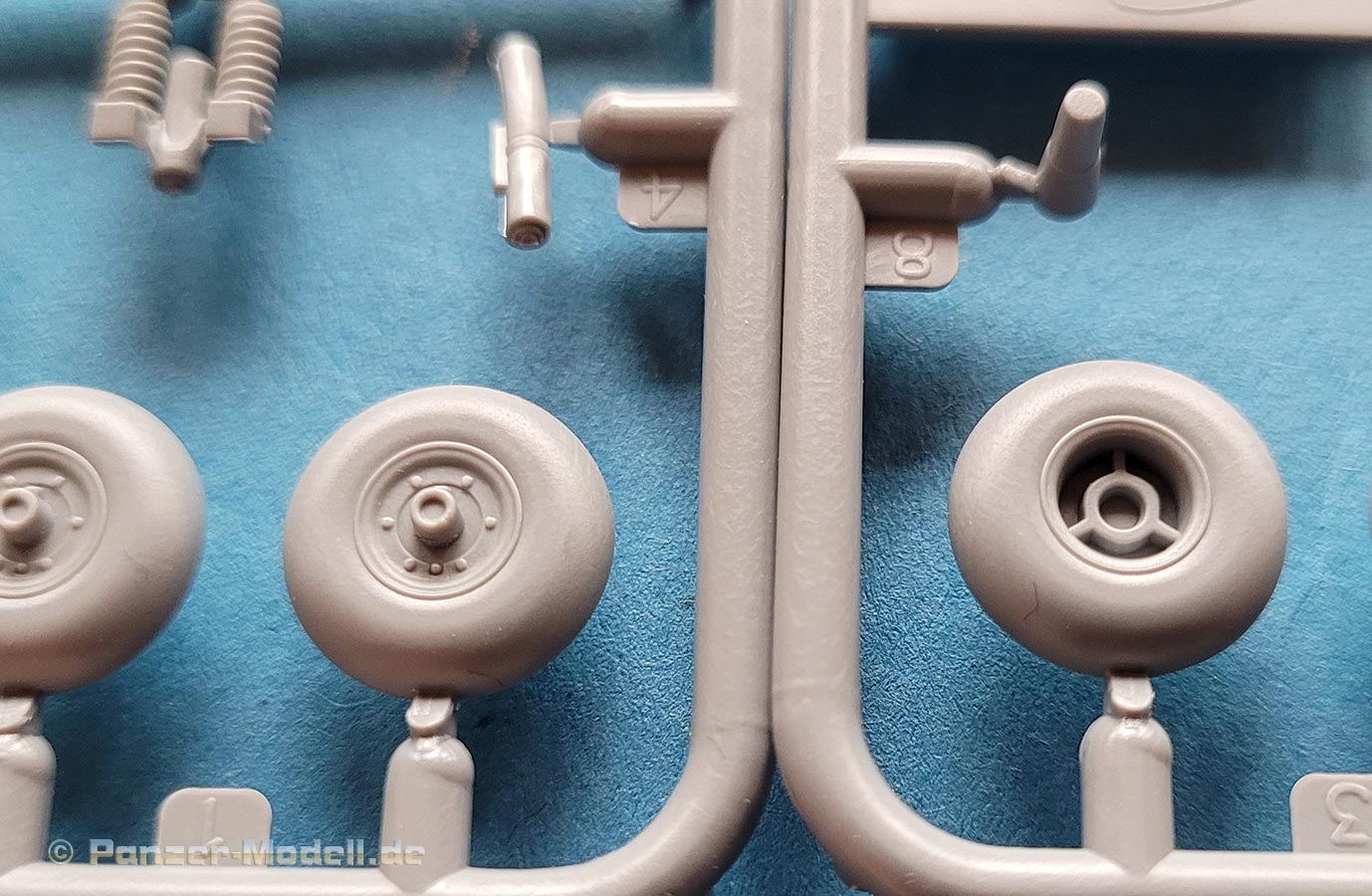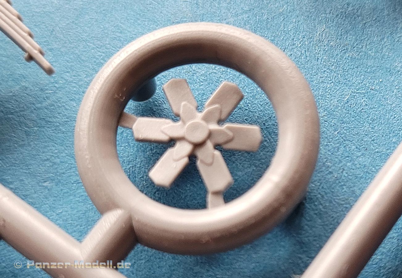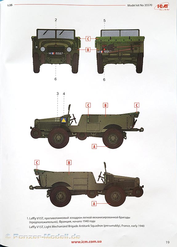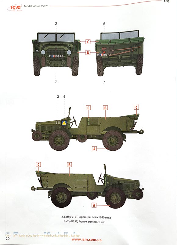 ICM ist immer mal für eine Überraschung gut und so haben wir Anfang 2022 Zuwachs bei den französischen Radfahrzeugen bekommen - mit dem Laffly V15T auch noch ein ungewöhnliches dazu, denn die Optik ist schon etwas ungewöhnlich - in diesem Fall hat ICM die "normale" 4 Rad Version als Zugfahrzeug für Kanonen der französischen Armee. Im Bausatzkarton finden sich 5 graue Spritzlinge, einen klaren Spritzling, 4 Vinylreifen und ein Decalbogen. Die Spritzlinge machen durch die Bank einen guten Eindruck. Die Teile sind sauber ausgespritzt und ohne Versatz. Die Details sind recht sauber und ansprechend. Der Chassisrahmen ist im Grunde einteilig und muss an der Front sogar noch um ein Stück erleichtert werden. Die Bauanleitung ist im typischen ICM Stil und weist mit erstaunlichen 93 Baustufen den Weg zum Ziel. Die Zeichnungen sind sauber und gut verständlich. Die Decals sind seidenmatt mit geringem Trägerrand und mit dünnen Trägerfilm. Zusammen mit den zwei farbig gedruckten Farbprofilen am Ende der Anleitung lassen sich folgende Fahrzeuge darstellen: