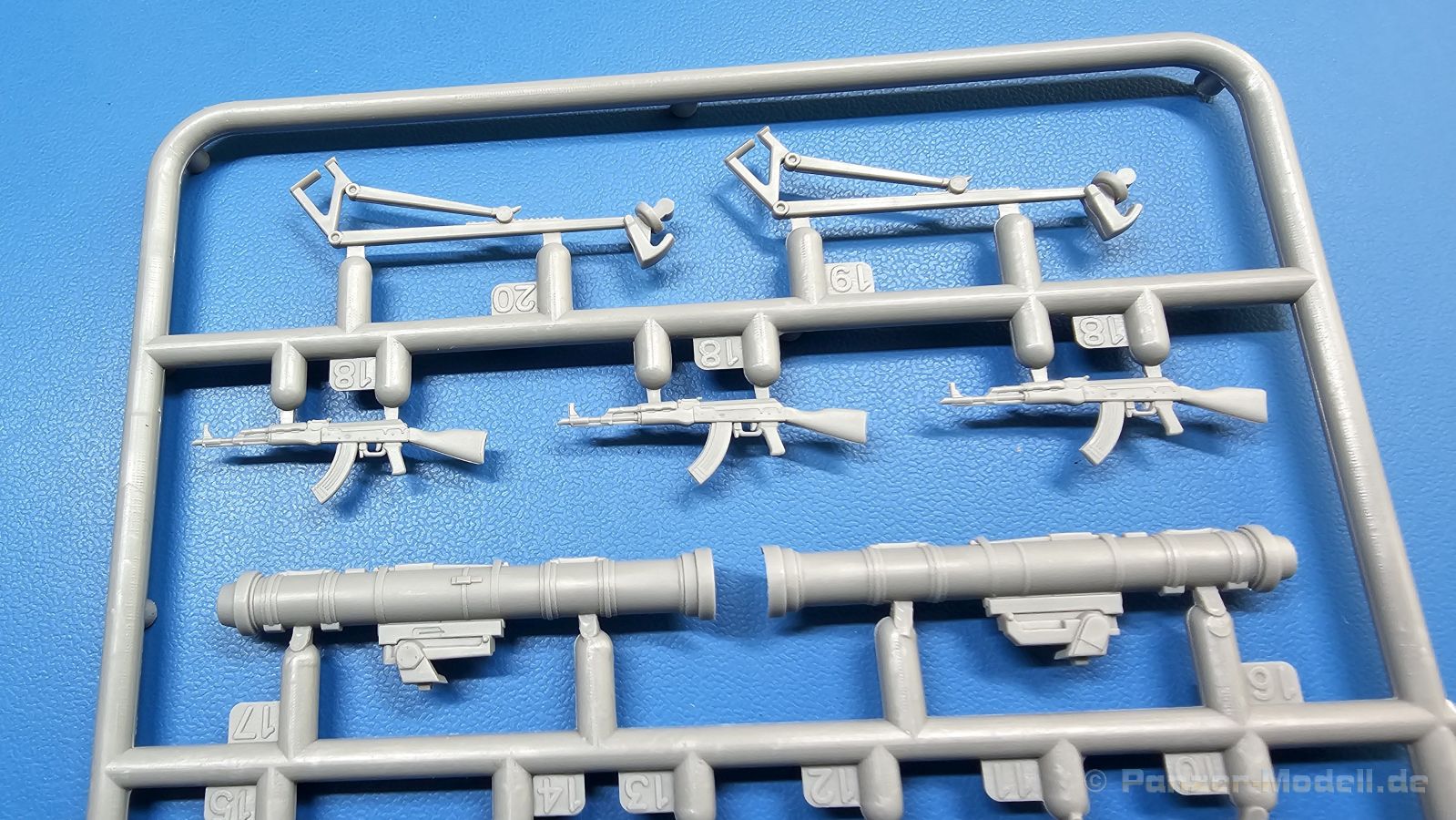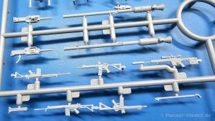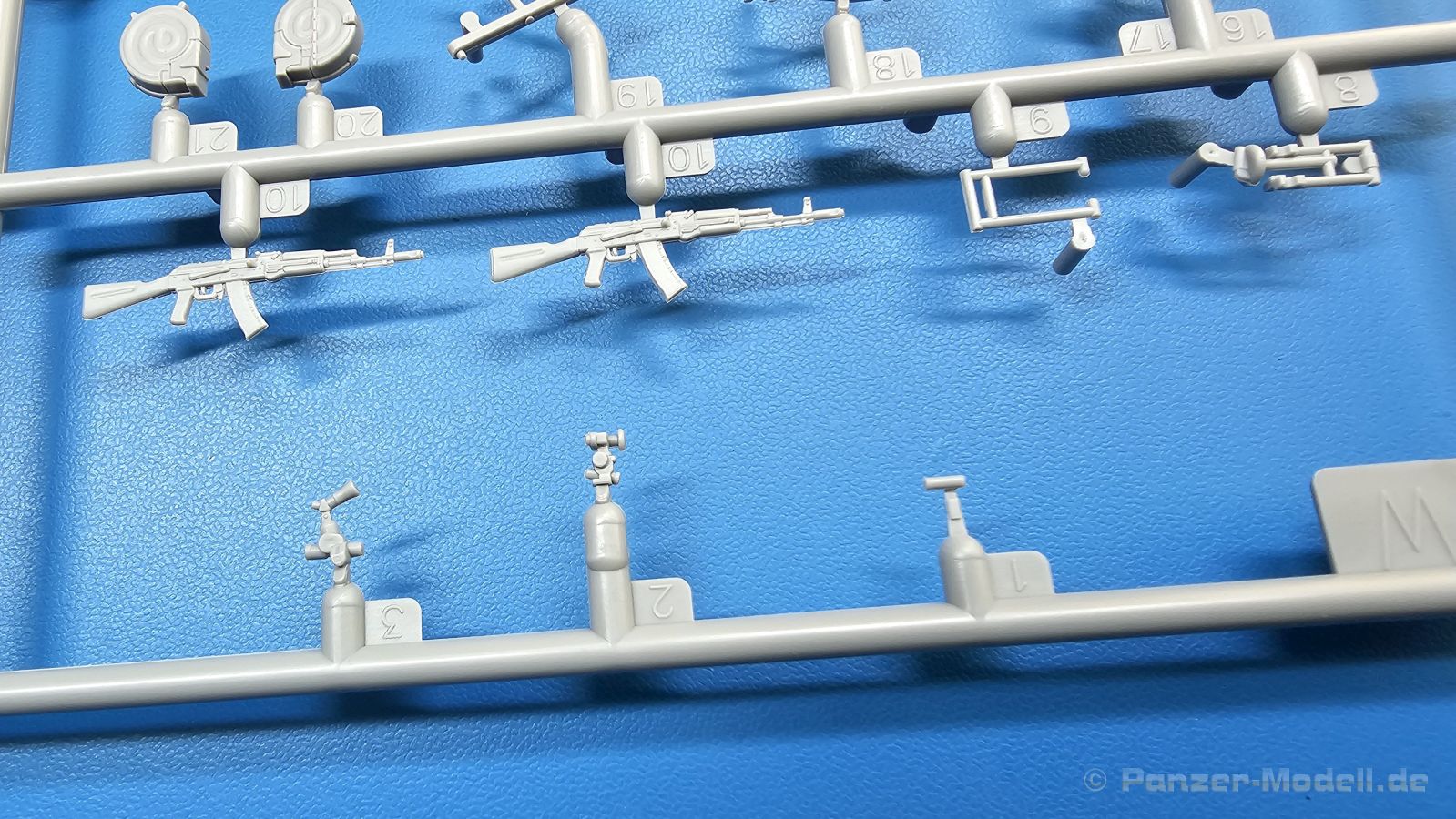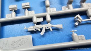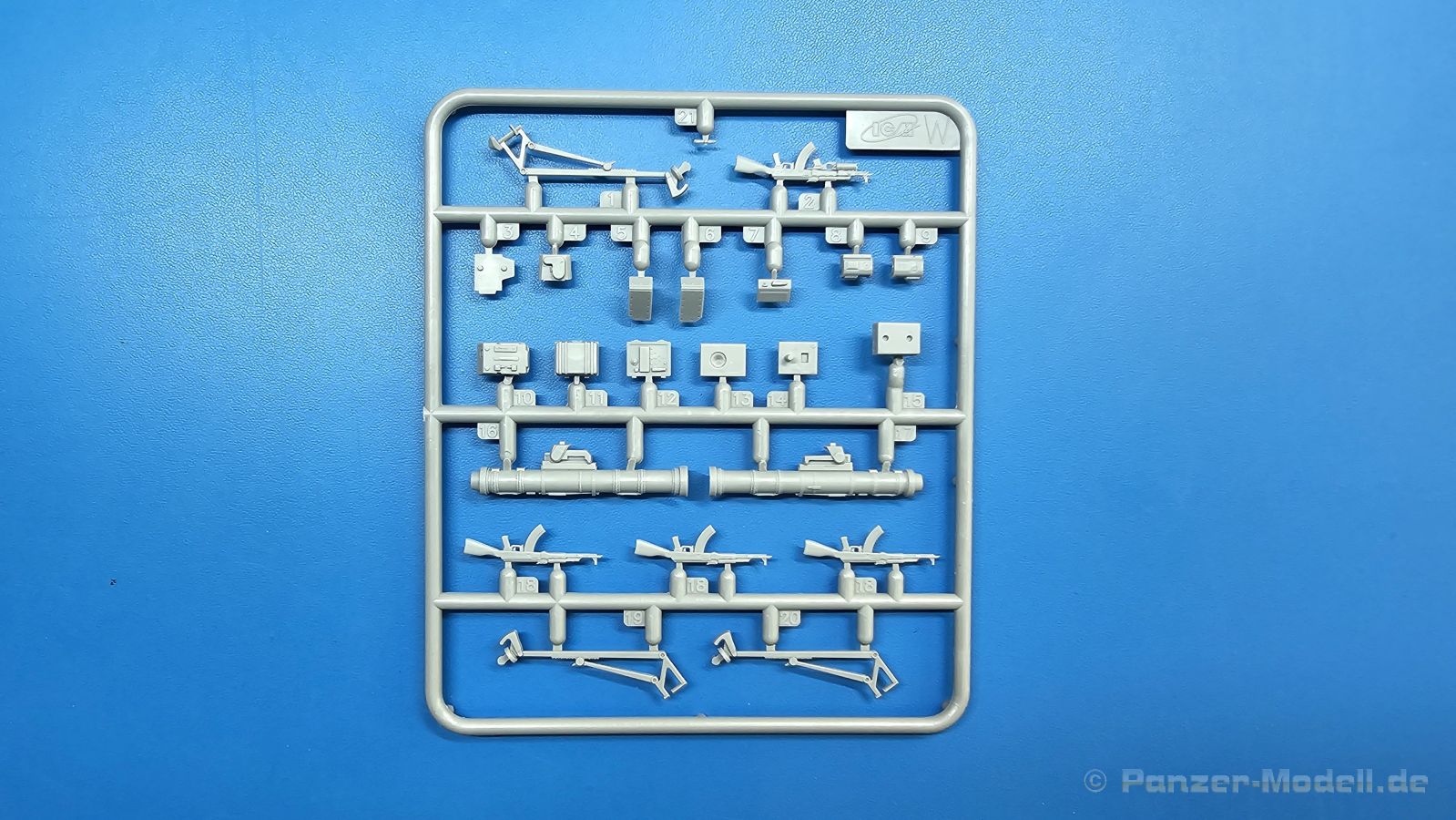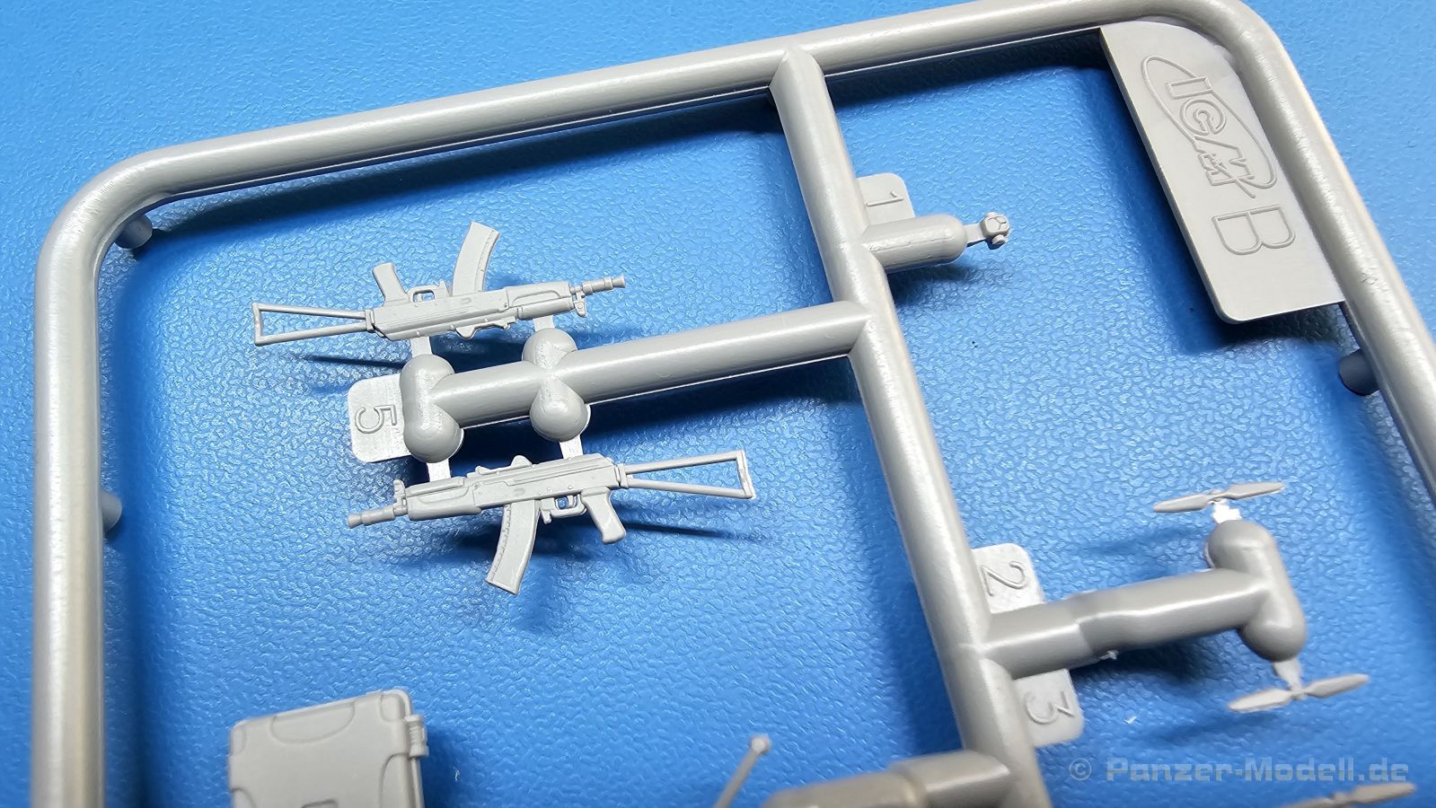 Das Original: Die ukrainischen Bodentruppen, darunter mechanisierte, motorisierte Infanterie-, Gebirgs-, Panzer- und Artilleriebrigaden, schulterten seit dem umfassenden Kriegsbeginn im Februar 2022 die Hauptlast der Verteidigung. Eine besonders aktive Rolle in anspruchsvollen Einsatzgebieten kam jedoch den Luftangriffs- und Marineinfanteriebrigaden zu. Trotz dieser enormen Belastung demonstrierten die ukrainischen Verteidigungskräfte ihre Fähigkeit zur pflichtbewussten Aufgabenerfüllung und erlangten durch ihre umfangreiche Kampferfahrung möglicherweise den Status der kampfbereitesten Armee Europas. Ihr Bewaffnungssystem stützt sich maßgeblich auf Kleinwaffen und Panzerabwehrwaffen. Die gegenwärtig eingesetzten Infanterieeinheiten verwenden dabei überwiegend Waffen aus inländischer und sowjetischer Produktion. Nennenswerte Beispiele hierfür sind die ukrainischen „Stugna“-Panzerabwehrraketen und die weit verbreiteten „Fort“-Pistolen. Spezialeinheiten greifen unter anderem auf das Sturmgewehr „Maluk“ (alias „Vulkan“) zurück. Darüber hinaus gewinnt der Einsatz von Waffen, die durch internationale materielle und technische Hilfe bereitgestellt werden, zunehmend an Bedeutung. Der Bausatz: Viele Bausätze von ICM sind durch den noch anhaltenten Ukraine Krieg geprägt. So auch das heutige Set, das im Einsatz befindliche Waffen und Zubehör der ukrainischen Streitkräfte beinhaltet. Der Karton mit Klappdeckel und farbigem Stülpdeckel ist 260 x 190 x 35 mm groß. Der Inhalt besteht aus 9 grauen Spritzlingen, einem recht großen Naßschiebebilderbogen und einer Bauanleitung. Die Teile sind sauber gespritzt, mit vielen Details. Auswerfer wurden aufgrund der Natur der Teile fast ausschließlich auf die Giessäste gesetzt, so dass die Teile unbeeinflusst sind. Viele Teile kommen mit einem Anguss aus, welches Nacharbeit spart. Hier und da ist feiner Grat, bzw. Formtrennnähte zu sehen. Es gibt 26 verschiedene Waffen und Beobachtungsdrohnen, die namentlich auch in der Anleitung benannt werden. So stellt man fest, dass es sich nicht nur um Waffen aus den sowjetisch/russischen und ukrainischen Arsenalen handelt, sondern auch um ausländische aus Unterstützungslieferungen. Viele bestehen aus nur einem Teil, welches der Detailierung aber keinen Abbruch tut. Die FORT und Beretta Pistolen kommen im Halfter daher, die SOG und Glock Kampfmesser im Schaft. Die größeren Waffen wie das UAR-10 Scharfschützengewehr, das PKM Maschinengewehr und das Beretta MG42/59 (italienischer Nachkriegsnachbau des MG42) werden mit Zweibein (eingeklappt oder aufgestellt), Griff, Munitionskasten und -gurt ergänzt. Auch das AK-47 mit Granatwerfer, der RPG-18 Granatwerfer, das Stinger Flugabwehrsystem und die RPG-7 Panzerfaust werden mit weiteren Teile ausgestattet. Für die RPG-7 liegt sogar noch eine weitere Rakete bei. Es gibt aber auch genug Bastelspaß im Karton. Das M2 Browning kommt mit 3-Bein, Munitionskasten und -gurt. Abfeuerungs- und Spanngriffe kommen separat daher. Auch der AGS-17 Granatwerfer kommt mit einem mehrteiligen Dreibein. Der Werfer selbst besteht aus zwei Hälften, so dass eine offene Mündung entsteht. Das Trommelmagazin ist zweiteilig. Fast fühlt man sich in Krieg der Welten versetzt, denn auch das rückstoßfreie SPG-9 Leichtgeschütz und das Stugna-P Panzerabwehrsystem kommen auf Dreibeinen daher. Das SPG-9 kommt mit zwei Hälften und geöffneter Mündung daher, Zieloptik und weitere Griff sind einzeln anzubauen. Das Stugna-P ist weit komplexer aufgebaut und besteht aus 18 Teilen. Dazu gehört auch eine aufgeklappte Bedienkonsole. Nur die Drähte muss man selbst hinzufügen. Am meisten hat man mit dem 1. Weltkriegs-Veteran zu tun, dem Maxim MG. Hier hat man nicht nur das MG, sondern auch das Transportgestell mit Speichenrädern, Schutzschild, Munitionskasten und -gurt. Den Zuggriff des Transportgestells kann man wahlweise nach hinten aus- oder nach vorn eingeklappt bauen. Den Sprung in die Moderne schaffen die zwei Kameradrohnen mit vier Zweiblattpropellern und Tragekoffer, aber ohne Fernbedienung. Als kleine Zugabe erhält man noch moderne Helme, die sich an den beiden W2 Spritzlingen befinden, aber sonst keine Erwähnung finden. Das Waffenset wäre allein schon toll, aber ICM legt noch einen großen Naßschiebebilderbogen mit ukrainischen Uniformabzeichen bei. Enthalten sind Einheitswappen für die Ärmel, Dienstgradabzeichen für die Schulterklappen vom Soldaten bis zum Oberstleutnant, Blutgruppeabzeichen und Ärmelflaggen. Die Bauanleitung im A4 Format hat 8 Seiten und ist in schwarz-weiß mit farbigen Akzenten gehalten. Erklärungen sind in Ukrainisch und in Englisch gehalten. Auf der ersten Seite finden sich Informationen zu den Waffen, Symbolerklärungen und eine Farbliste nur für ICM Farben, aber der Hersteller stellt auf seiner Seite eine Farbübersicht mit Konvertierungstabelle zur Verfügung. Die Spritzlingübersicht ist auf Seite 2, gefolgt von einer Übersicht von 20 Handwaffen. Hier werden ggfs. noch weitere Anbauteile und die Bemalungen angegeben. Auch wird jede der 20 Waffen namentlich genannt. Der Bau der komplexeren Waffen wird auf drei Seiten erklärt. Hier gibt es je nach Waffen 3 bis 11 Bauschritte, die aus meiner Sicht leicht verständlich sind. Die letzten beiden Seiten sind den Naßschiebebildern gewidmet. Für jedes Wappen wird die Einheit angegeben, die Dienstgrad- und andere Abzeichen benannt. Das Set ist eine gute Ergänzung für ukrainische Fahrzeuge und Figuren. Grad der Naßschiebebilderbogen wird willkommen sein, da die Figuren-Sets von ICM meist ohne Uniformabzeichen kommen. Der Preis in Deutschland schwankt erheblich zwischen 17 und 22 Euro.