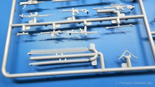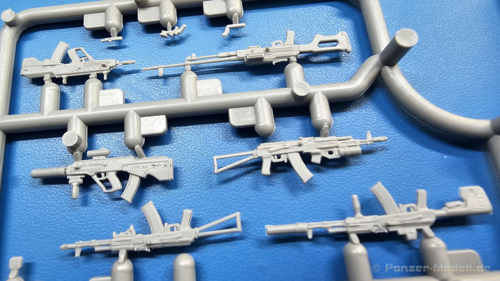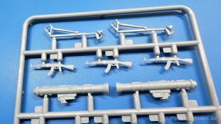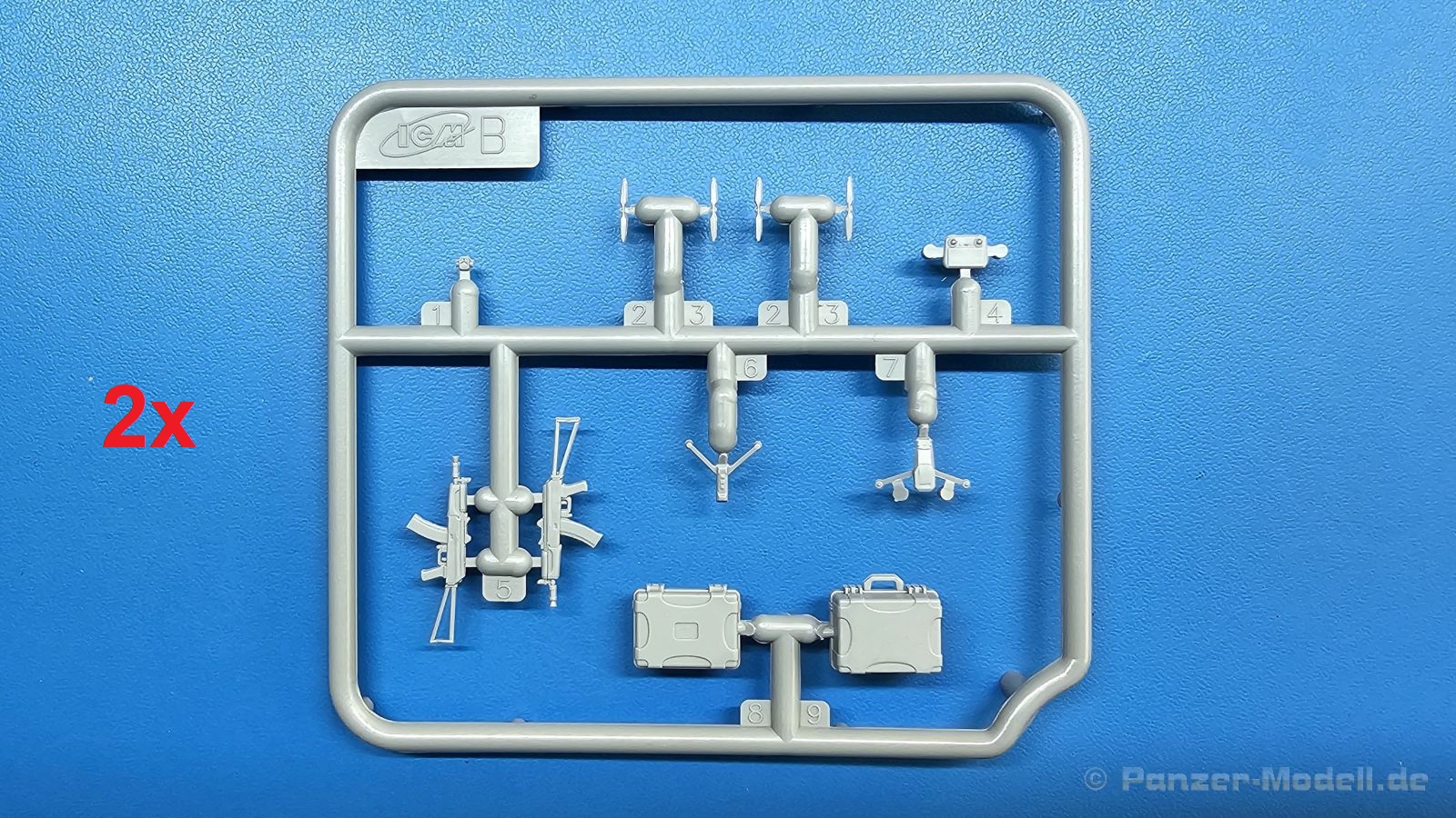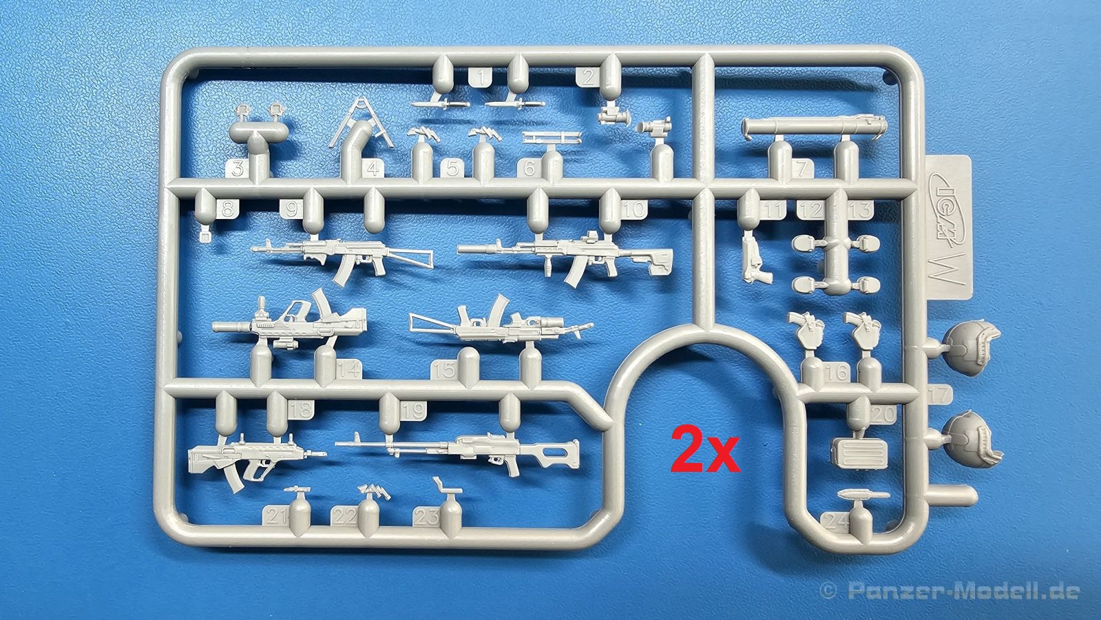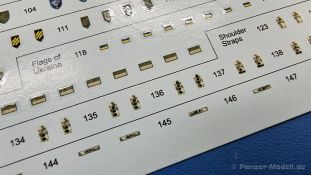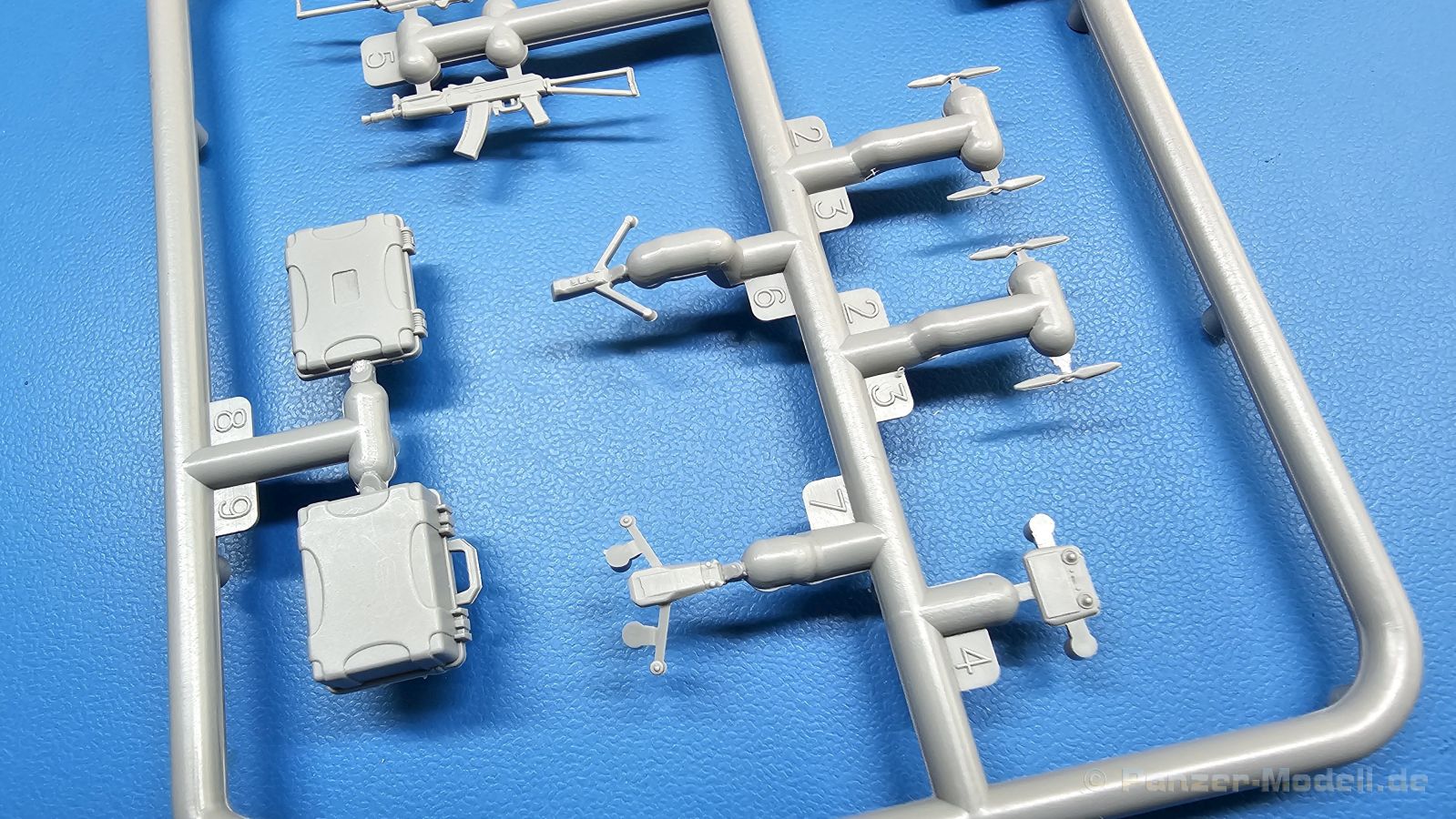 Das Original: Die ukrainischen Bodentruppen, darunter mechanisierte, motorisierte Infanterie-, Gebirgs-, Panzer- und Artilleriebrigaden, schulterten seit dem umfassenden Kriegsbeginn im Februar 2022 die Hauptlast der Verteidigung. Eine besonders aktive Rolle in anspruchsvollen Einsatzgebieten kam jedoch den Luftangriffs- und Marineinfanteriebrigaden zu. Trotz dieser enormen Belastung demonstrierten die ukrainischen Verteidigungskräfte ihre Fähigkeit zur pflichtbewussten Aufgabenerfüllung und erlangten durch ihre umfangreiche Kampferfahrung möglicherweise den Status der kampfbereitesten Armee Europas. Ihr Bewaffnungssystem stützt sich maßgeblich auf Kleinwaffen und Panzerabwehrwaffen. Die gegenwärtig eingesetzten Infanterieeinheiten verwenden dabei überwiegend Waffen aus inländischer und sowjetischer Produktion. Nennenswerte Beispiele hierfür sind die ukrainischen „Stugna“-Panzerabwehrraketen und die weit verbreiteten „Fort“-Pistolen. Spezialeinheiten greifen unter anderem auf das Sturmgewehr „Maluk“ (alias „Vulkan“) zurück. Darüber hinaus gewinnt der Einsatz von Waffen, die durch internationale materielle und technische Hilfe bereitgestellt werden, zunehmend an Bedeutung. Der Bausatz: Viele Bausätze von ICM sind durch den noch anhaltenten Ukraine Krieg geprägt. So auch das heutige Set, das im Einsatz befindliche Waffen und Zubehör der ukrainischen Streitkräfte beinhaltet. Der Karton mit Klappdeckel und farbigem Stülpdeckel ist 260 x 190 x 35 mm groß. Der Inhalt besteht aus 9 grauen Spritzlingen, einem recht großen Naßschiebebilderbogen und einer Bauanleitung. Die Teile sind sauber gespritzt, mit vielen Details. Auswerfer wurden aufgrund der Natur der Teile fast ausschließlich auf die Giessäste gesetzt, so dass die Teile unbeeinflusst sind. Viele Teile kommen mit einem Anguss aus, welches Nacharbeit spart. Hier und da ist feiner Grat, bzw. Formtrennnähte zu sehen. Es gibt 26 verschiedene Waffen und Beobachtungsdrohnen, die namentlich auch in der Anleitung benannt werden. So stellt man fest, dass es sich nicht nur um Waffen aus den sowjetisch/russischen und ukrainischen Arsenalen handelt, sondern auch um ausländische aus Unterstützungslieferungen. Viele bestehen aus nur einem Teil, welches der Detailierung aber keinen Abbruch tut. Die FORT und Beretta Pistolen kommen im Halfter daher, die SOG und Glock Kampfmesser im Schaft. Die größeren Waffen wie das UAR-10 Scharfschützengewehr, das PKM Maschinengewehr und das Beretta MG42/59 (italienischer Nachkriegsnachbau des MG42) werden mit Zweibein (eingeklappt oder aufgestellt), Griff, Munitionskasten und -gurt ergänzt. Auch das AK-47 mit Granatwerfer, der RPG-18 Granatwerfer, das Stinger Flugabwehrsystem und die RPG-7 Panzerfaust werden mit weiteren Teile ausgestattet. Für die RPG-7 liegt sogar noch eine weitere Rakete bei. Es gibt aber auch genug Bastelspaß im Karton. Das M2 Browning kommt mit 3-Bein, Munitionskasten und -gurt. Abfeuerungs- und Spanngriffe kommen separat daher. Auch der AGS-17 Granatwerfer kommt mit einem mehrteiligen Dreibein. Der Werfer selbst besteht aus zwei Hälften, so dass eine offene Mündung entsteht. Das Trommelmagazin ist zweiteilig. Fast fühlt man sich in Krieg der Welten versetzt, denn auch das rückstoßfreie SPG-9 Leichtgeschütz und das Stugna-P Panzerabwehrsystem kommen auf Dreibeinen daher. Das SPG-9 kommt mit zwei Hälften und geöffneter Mündung daher, Zieloptik und weitere Griff sind einzeln anzubauen. Das Stugna-P ist weit komplexer aufgebaut und besteht aus 18 Teilen. Dazu gehört auch eine aufgeklappte Bedienkonsole. Nur die Drähte muss man selbst hinzufügen. Am meisten hat man mit dem 1. Weltkriegs-Veteran zu tun, dem Maxim MG. Hier hat man nicht nur das MG, sondern auch das Transportgestell mit Speichenrädern, Schutzschild, Munitionskasten und -gurt. Den Zuggriff des Transportgestells kann man wahlweise nach hinten aus- oder nach vorn eingeklappt bauen. Den Sprung in die Moderne schaffen die zwei Kameradrohnen mit vier Zweiblattpropellern und Tragekoffer, aber ohne Fernbedienung. Als kleine Zugabe erhält man noch moderne Helme, die sich an den beiden W2 Spritzlingen befinden, aber sonst keine Erwähnung finden. Das Waffenset wäre allein schon toll, aber ICM legt noch einen großen Naßschiebebilderbogen mit ukrainischen Uniformabzeichen bei. Enthalten sind Einheitswappen für die Ärmel, Dienstgradabzeichen für die Schulterklappen vom Soldaten bis zum Oberstleutnant, Blutgruppeabzeichen und Ärmelflaggen. Die Bauanleitung im A4 Format hat 8 Seiten und ist in schwarz-weiß mit farbigen Akzenten gehalten. Erklärungen sind in Ukrainisch und in Englisch gehalten. Auf der ersten Seite finden sich Informationen zu den Waffen, Symbolerklärungen und eine Farbliste nur für ICM Farben, aber der Hersteller stellt auf seiner Seite eine Farbübersicht mit Konvertierungstabelle zur Verfügung. Die Spritzlingübersicht ist auf Seite 2, gefolgt von einer Übersicht von 20 Handwaffen. Hier werden ggfs. noch weitere Anbauteile und die Bemalungen angegeben. Auch wird jede der 20 Waffen namentlich genannt. Der Bau der komplexeren Waffen wird auf drei Seiten erklärt. Hier gibt es je nach Waffen 3 bis 11 Bauschritte, die aus meiner Sicht leicht verständlich sind. Die letzten beiden Seiten sind den Naßschiebebildern gewidmet. Für jedes Wappen wird die Einheit angegeben, die Dienstgrad- und andere Abzeichen benannt. Das Set ist eine gute Ergänzung für ukrainische Fahrzeuge und Figuren. Grad der Naßschiebebilderbogen wird willkommen sein, da die Figuren-Sets von ICM meist ohne Uniformabzeichen kommen. Der Preis in Deutschland schwankt erheblich zwischen 17 und 22 Euro.