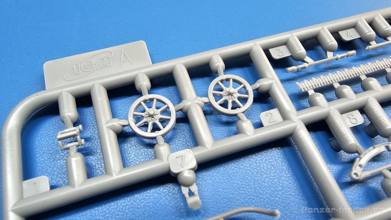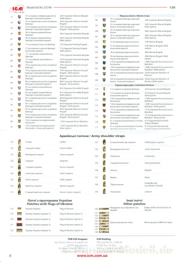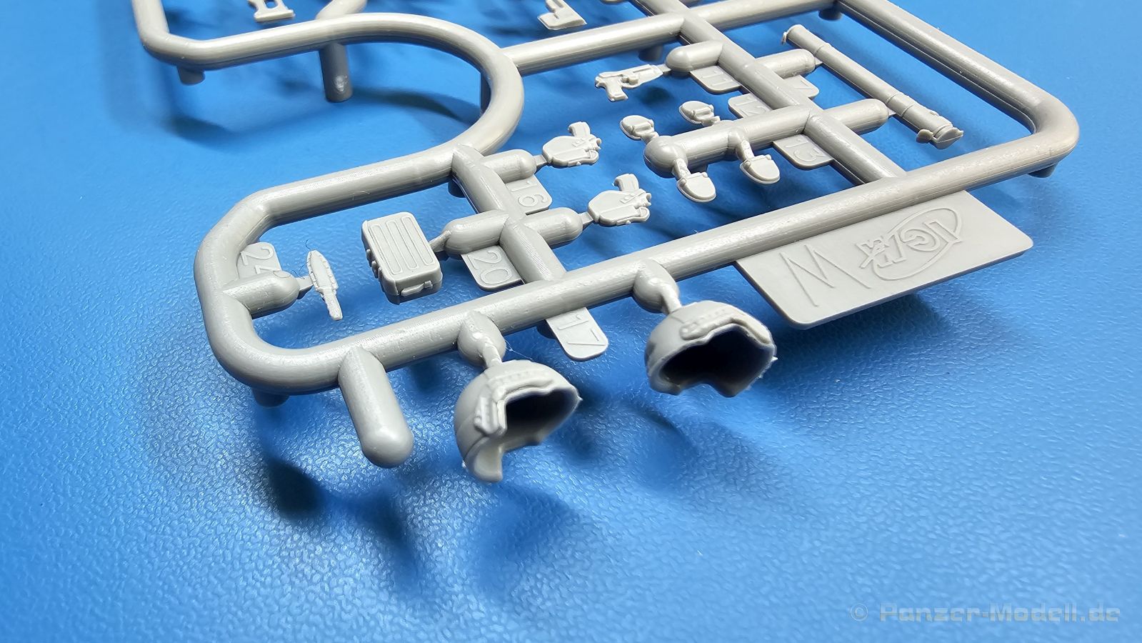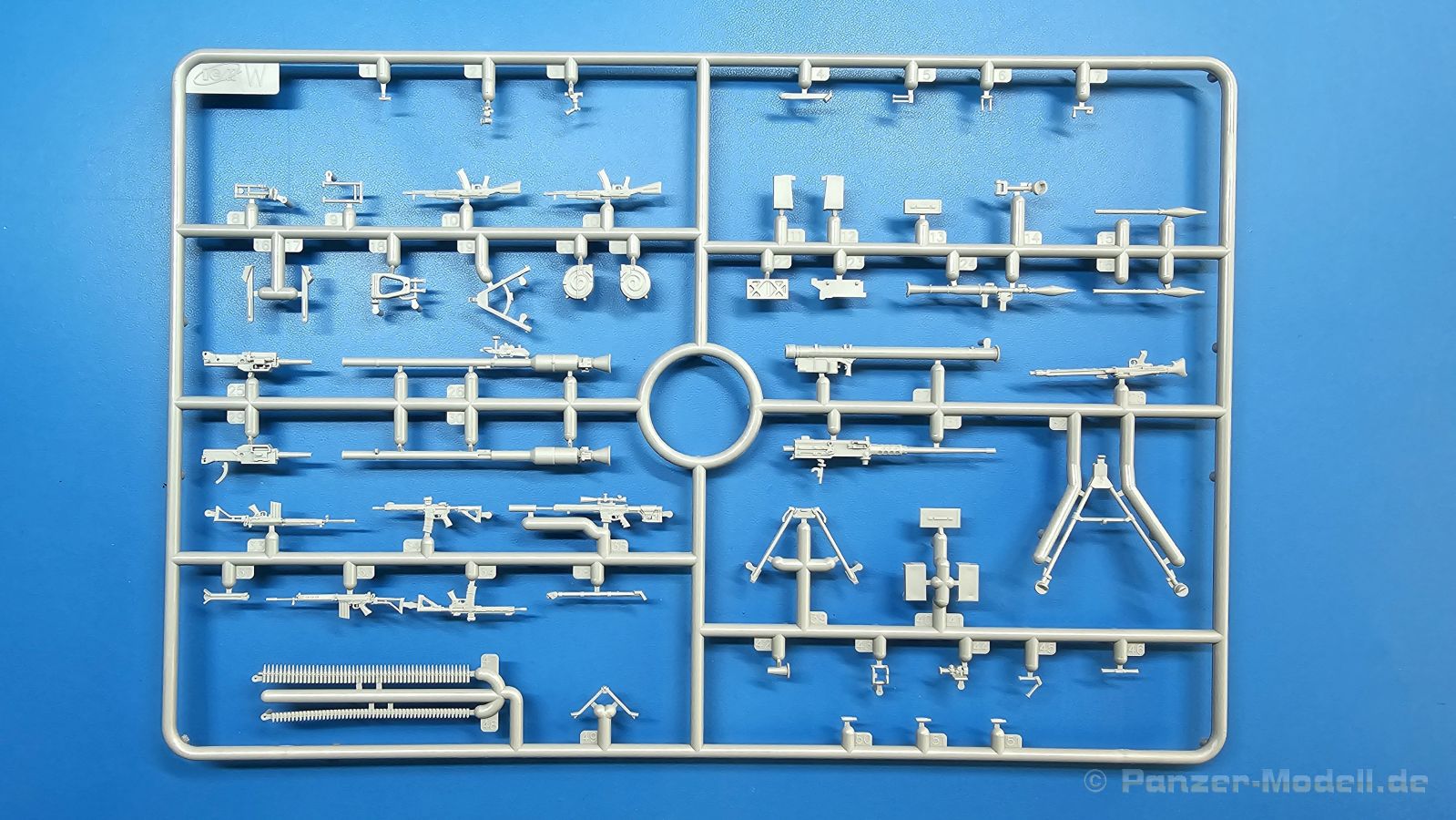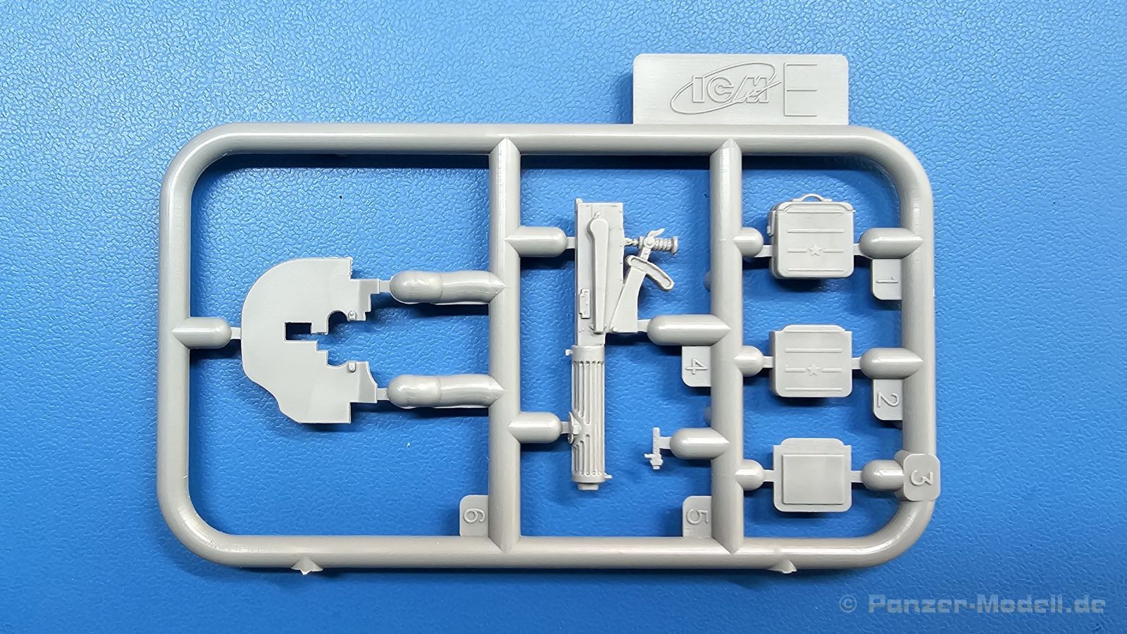 Das Original: Die ukrainischen Bodentruppen, darunter mechanisierte, motorisierte Infanterie-, Gebirgs-, Panzer- und Artilleriebrigaden, schulterten seit dem umfassenden Kriegsbeginn im Februar 2022 die Hauptlast der Verteidigung. Eine besonders aktive Rolle in anspruchsvollen Einsatzgebieten kam jedoch den Luftangriffs- und Marineinfanteriebrigaden zu. Trotz dieser enormen Belastung demonstrierten die ukrainischen Verteidigungskräfte ihre Fähigkeit zur pflichtbewussten Aufgabenerfüllung und erlangten durch ihre umfangreiche Kampferfahrung möglicherweise den Status der kampfbereitesten Armee Europas. Ihr Bewaffnungssystem stützt sich maßgeblich auf Kleinwaffen und Panzerabwehrwaffen. Die gegenwärtig eingesetzten Infanterieeinheiten verwenden dabei überwiegend Waffen aus inländischer und sowjetischer Produktion. Nennenswerte Beispiele hierfür sind die ukrainischen „Stugna“-Panzerabwehrraketen und die weit verbreiteten „Fort“-Pistolen. Spezialeinheiten greifen unter anderem auf das Sturmgewehr „Maluk“ (alias „Vulkan“) zurück. Darüber hinaus gewinnt der Einsatz von Waffen, die durch internationale materielle und technische Hilfe bereitgestellt werden, zunehmend an Bedeutung. Der Bausatz: Viele Bausätze von ICM sind durch den noch anhaltenten Ukraine Krieg geprägt. So auch das heutige Set, das im Einsatz befindliche Waffen und Zubehör der ukrainischen Streitkräfte beinhaltet. Der Karton mit Klappdeckel und farbigem Stülpdeckel ist 260 x 190 x 35 mm groß. Der Inhalt besteht aus 9 grauen Spritzlingen, einem recht großen Naßschiebebilderbogen und einer Bauanleitung. Die Teile sind sauber gespritzt, mit vielen Details. Auswerfer wurden aufgrund der Natur der Teile fast ausschließlich auf die Giessäste gesetzt, so dass die Teile unbeeinflusst sind. Viele Teile kommen mit einem Anguss aus, welches Nacharbeit spart. Hier und da ist feiner Grat, bzw. Formtrennnähte zu sehen. Es gibt 26 verschiedene Waffen und Beobachtungsdrohnen, die namentlich auch in der Anleitung benannt werden. So stellt man fest, dass es sich nicht nur um Waffen aus den sowjetisch/russischen und ukrainischen Arsenalen handelt, sondern auch um ausländische aus Unterstützungslieferungen. Viele bestehen aus nur einem Teil, welches der Detailierung aber keinen Abbruch tut. Die FORT und Beretta Pistolen kommen im Halfter daher, die SOG und Glock Kampfmesser im Schaft. Die größeren Waffen wie das UAR-10 Scharfschützengewehr, das PKM Maschinengewehr und das Beretta MG42/59 (italienischer Nachkriegsnachbau des MG42) werden mit Zweibein (eingeklappt oder aufgestellt), Griff, Munitionskasten und -gurt ergänzt. Auch das AK-47 mit Granatwerfer, der RPG-18 Granatwerfer, das Stinger Flugabwehrsystem und die RPG-7 Panzerfaust werden mit weiteren Teile ausgestattet. Für die RPG-7 liegt sogar noch eine weitere Rakete bei. Es gibt aber auch genug Bastelspaß im Karton. Das M2 Browning kommt mit 3-Bein, Munitionskasten und -gurt. Abfeuerungs- und Spanngriffe kommen separat daher. Auch der AGS-17 Granatwerfer kommt mit einem mehrteiligen Dreibein. Der Werfer selbst besteht aus zwei Hälften, so dass eine offene Mündung entsteht. Das Trommelmagazin ist zweiteilig. Fast fühlt man sich in Krieg der Welten versetzt, denn auch das rückstoßfreie SPG-9 Leichtgeschütz und das Stugna-P Panzerabwehrsystem kommen auf Dreibeinen daher. Das SPG-9 kommt mit zwei Hälften und geöffneter Mündung daher, Zieloptik und weitere Griff sind einzeln anzubauen. Das Stugna-P ist weit komplexer aufgebaut und besteht aus 18 Teilen. Dazu gehört auch eine aufgeklappte Bedienkonsole. Nur die Drähte muss man selbst hinzufügen. Am meisten hat man mit dem 1. Weltkriegs-Veteran zu tun, dem Maxim MG. Hier hat man nicht nur das MG, sondern auch das Transportgestell mit Speichenrädern, Schutzschild, Munitionskasten und -gurt. Den Zuggriff des Transportgestells kann man wahlweise nach hinten aus- oder nach vorn eingeklappt bauen. Den Sprung in die Moderne schaffen die zwei Kameradrohnen mit vier Zweiblattpropellern und Tragekoffer, aber ohne Fernbedienung. Als kleine Zugabe erhält man noch moderne Helme, die sich an den beiden W2 Spritzlingen befinden, aber sonst keine Erwähnung finden. Das Waffenset wäre allein schon toll, aber ICM legt noch einen großen Naßschiebebilderbogen mit ukrainischen Uniformabzeichen bei. Enthalten sind Einheitswappen für die Ärmel, Dienstgradabzeichen für die Schulterklappen vom Soldaten bis zum Oberstleutnant, Blutgruppeabzeichen und Ärmelflaggen. Die Bauanleitung im A4 Format hat 8 Seiten und ist in schwarz-weiß mit farbigen Akzenten gehalten. Erklärungen sind in Ukrainisch und in Englisch gehalten. Auf der ersten Seite finden sich Informationen zu den Waffen, Symbolerklärungen und eine Farbliste nur für ICM Farben, aber der Hersteller stellt auf seiner Seite eine Farbübersicht mit Konvertierungstabelle zur Verfügung. Die Spritzlingübersicht ist auf Seite 2, gefolgt von einer Übersicht von 20 Handwaffen. Hier werden ggfs. noch weitere Anbauteile und die Bemalungen angegeben. Auch wird jede der 20 Waffen namentlich genannt. Der Bau der komplexeren Waffen wird auf drei Seiten erklärt. Hier gibt es je nach Waffen 3 bis 11 Bauschritte, die aus meiner Sicht leicht verständlich sind. Die letzten beiden Seiten sind den Naßschiebebildern gewidmet. Für jedes Wappen wird die Einheit angegeben, die Dienstgrad- und andere Abzeichen benannt. Das Set ist eine gute Ergänzung für ukrainische Fahrzeuge und Figuren. Grad der Naßschiebebilderbogen wird willkommen sein, da die Figuren-Sets von ICM meist ohne Uniformabzeichen kommen. Der Preis in Deutschland schwankt erheblich zwischen 17 und 22 Euro.