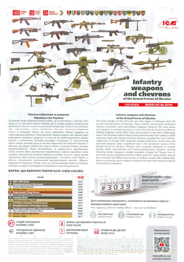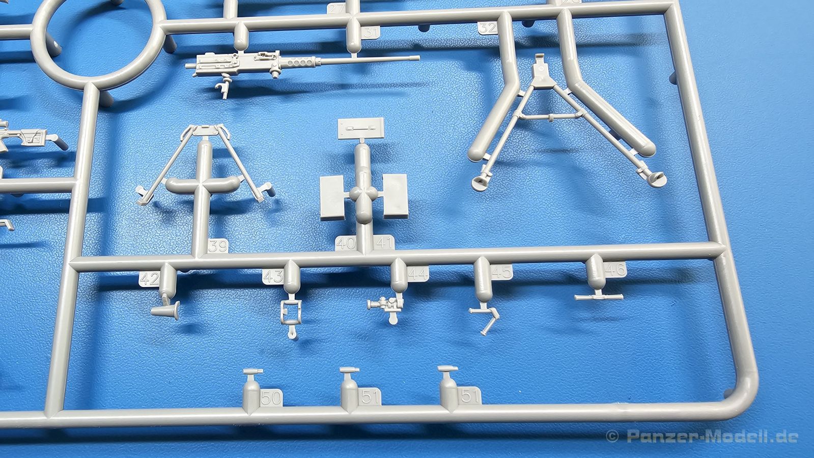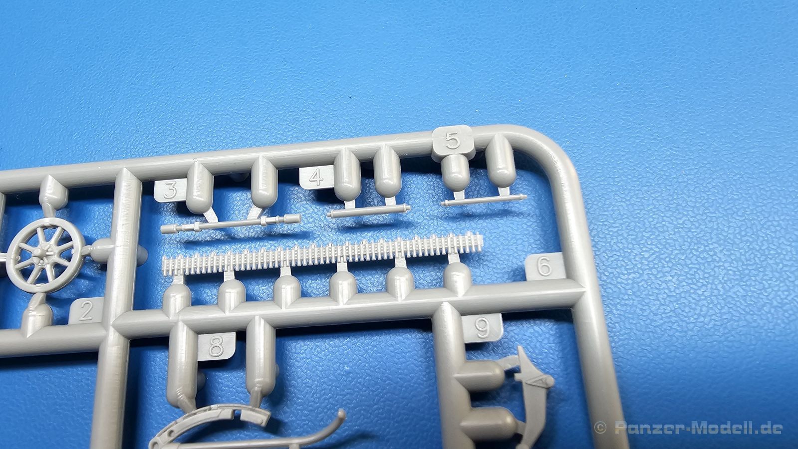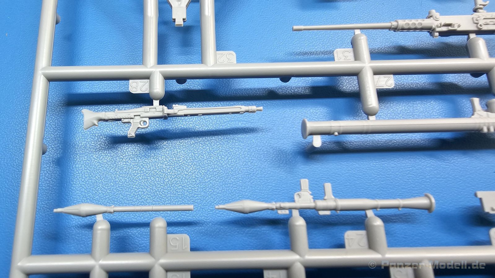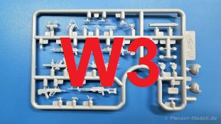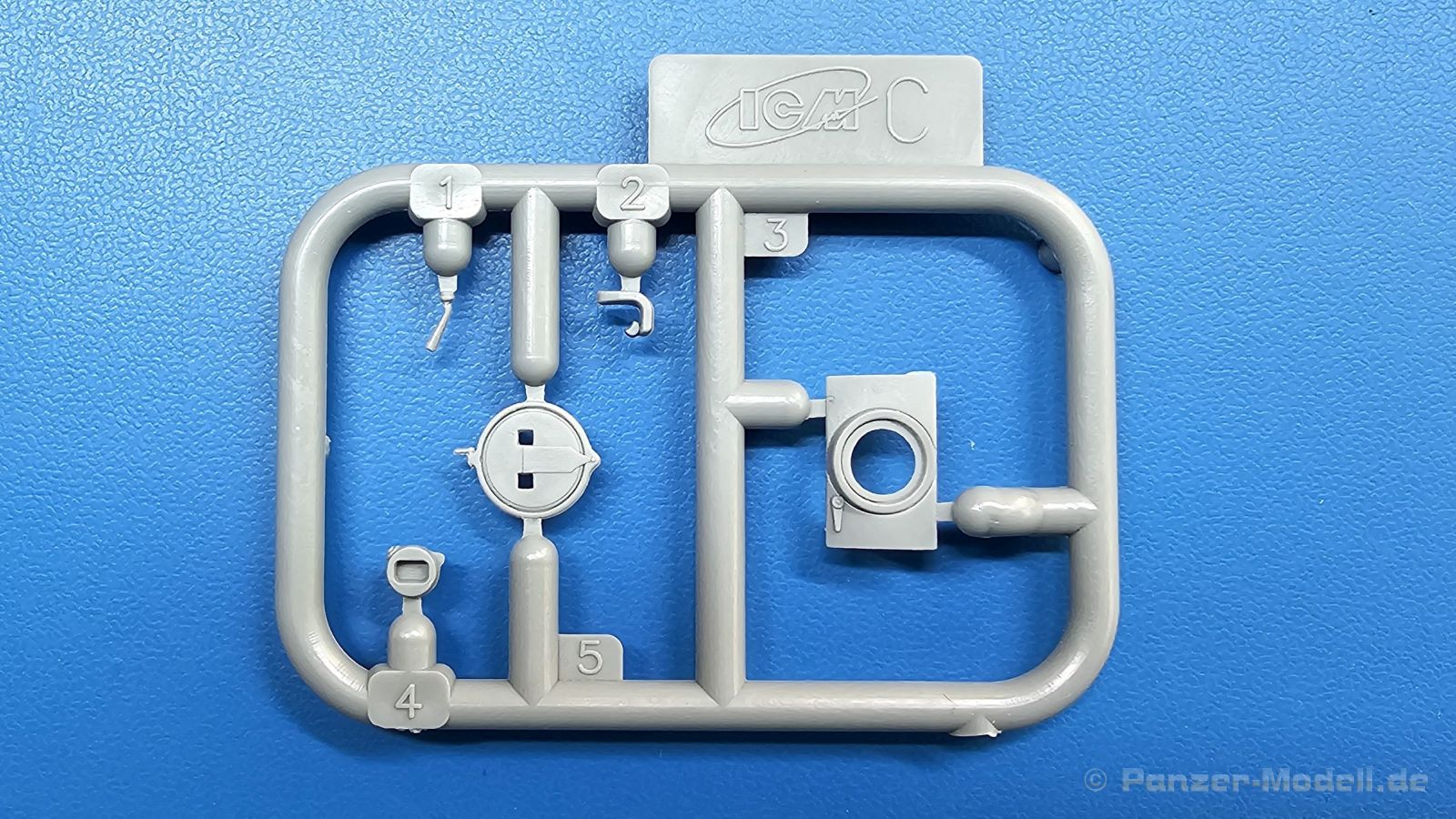 Das Original: Die ukrainischen Bodentruppen, darunter mechanisierte, motorisierte Infanterie-, Gebirgs-, Panzer- und Artilleriebrigaden, schulterten seit dem umfassenden Kriegsbeginn im Februar 2022 die Hauptlast der Verteidigung. Eine besonders aktive Rolle in anspruchsvollen Einsatzgebieten kam jedoch den Luftangriffs- und Marineinfanteriebrigaden zu. Trotz dieser enormen Belastung demonstrierten die ukrainischen Verteidigungskräfte ihre Fähigkeit zur pflichtbewussten Aufgabenerfüllung und erlangten durch ihre umfangreiche Kampferfahrung möglicherweise den Status der kampfbereitesten Armee Europas. Ihr Bewaffnungssystem stützt sich maßgeblich auf Kleinwaffen und Panzerabwehrwaffen. Die gegenwärtig eingesetzten Infanterieeinheiten verwenden dabei überwiegend Waffen aus inländischer und sowjetischer Produktion. Nennenswerte Beispiele hierfür sind die ukrainischen „Stugna“-Panzerabwehrraketen und die weit verbreiteten „Fort“-Pistolen. Spezialeinheiten greifen unter anderem auf das Sturmgewehr „Maluk“ (alias „Vulkan“) zurück. Darüber hinaus gewinnt der Einsatz von Waffen, die durch internationale materielle und technische Hilfe bereitgestellt werden, zunehmend an Bedeutung. Der Bausatz: Viele Bausätze von ICM sind durch den noch anhaltenten Ukraine Krieg geprägt. So auch das heutige Set, das im Einsatz befindliche Waffen und Zubehör der ukrainischen Streitkräfte beinhaltet. Der Karton mit Klappdeckel und farbigem Stülpdeckel ist 260 x 190 x 35 mm groß. Der Inhalt besteht aus 9 grauen Spritzlingen, einem recht großen Naßschiebebilderbogen und einer Bauanleitung. Die Teile sind sauber gespritzt, mit vielen Details. Auswerfer wurden aufgrund der Natur der Teile fast ausschließlich auf die Giessäste gesetzt, so dass die Teile unbeeinflusst sind. Viele Teile kommen mit einem Anguss aus, welches Nacharbeit spart. Hier und da ist feiner Grat, bzw. Formtrennnähte zu sehen. Es gibt 26 verschiedene Waffen und Beobachtungsdrohnen, die namentlich auch in der Anleitung benannt werden. So stellt man fest, dass es sich nicht nur um Waffen aus den sowjetisch/russischen und ukrainischen Arsenalen handelt, sondern auch um ausländische aus Unterstützungslieferungen. Viele bestehen aus nur einem Teil, welches der Detailierung aber keinen Abbruch tut. Die FORT und Beretta Pistolen kommen im Halfter daher, die SOG und Glock Kampfmesser im Schaft. Die größeren Waffen wie das UAR-10 Scharfschützengewehr, das PKM Maschinengewehr und das Beretta MG42/59 (italienischer Nachkriegsnachbau des MG42) werden mit Zweibein (eingeklappt oder aufgestellt), Griff, Munitionskasten und -gurt ergänzt. Auch das AK-47 mit Granatwerfer, der RPG-18 Granatwerfer, das Stinger Flugabwehrsystem und die RPG-7 Panzerfaust werden mit weiteren Teile ausgestattet. Für die RPG-7 liegt sogar noch eine weitere Rakete bei. Es gibt aber auch genug Bastelspaß im Karton. Das M2 Browning kommt mit 3-Bein, Munitionskasten und -gurt. Abfeuerungs- und Spanngriffe kommen separat daher. Auch der AGS-17 Granatwerfer kommt mit einem mehrteiligen Dreibein. Der Werfer selbst besteht aus zwei Hälften, so dass eine offene Mündung entsteht. Das Trommelmagazin ist zweiteilig. Fast fühlt man sich in Krieg der Welten versetzt, denn auch das rückstoßfreie SPG-9 Leichtgeschütz und das Stugna-P Panzerabwehrsystem kommen auf Dreibeinen daher. Das SPG-9 kommt mit zwei Hälften und geöffneter Mündung daher, Zieloptik und weitere Griff sind einzeln anzubauen. Das Stugna-P ist weit komplexer aufgebaut und besteht aus 18 Teilen. Dazu gehört auch eine aufgeklappte Bedienkonsole. Nur die Drähte muss man selbst hinzufügen. Am meisten hat man mit dem 1. Weltkriegs-Veteran zu tun, dem Maxim MG. Hier hat man nicht nur das MG, sondern auch das Transportgestell mit Speichenrädern, Schutzschild, Munitionskasten und -gurt. Den Zuggriff des Transportgestells kann man wahlweise nach hinten aus- oder nach vorn eingeklappt bauen. Den Sprung in die Moderne schaffen die zwei Kameradrohnen mit vier Zweiblattpropellern und Tragekoffer, aber ohne Fernbedienung. Als kleine Zugabe erhält man noch moderne Helme, die sich an den beiden W2 Spritzlingen befinden, aber sonst keine Erwähnung finden. Das Waffenset wäre allein schon toll, aber ICM legt noch einen großen Naßschiebebilderbogen mit ukrainischen Uniformabzeichen bei. Enthalten sind Einheitswappen für die Ärmel, Dienstgradabzeichen für die Schulterklappen vom Soldaten bis zum Oberstleutnant, Blutgruppeabzeichen und Ärmelflaggen. Die Bauanleitung im A4 Format hat 8 Seiten und ist in schwarz-weiß mit farbigen Akzenten gehalten. Erklärungen sind in Ukrainisch und in Englisch gehalten. Auf der ersten Seite finden sich Informationen zu den Waffen, Symbolerklärungen und eine Farbliste nur für ICM Farben, aber der Hersteller stellt auf seiner Seite eine Farbübersicht mit Konvertierungstabelle zur Verfügung. Die Spritzlingübersicht ist auf Seite 2, gefolgt von einer Übersicht von 20 Handwaffen. Hier werden ggfs. noch weitere Anbauteile und die Bemalungen angegeben. Auch wird jede der 20 Waffen namentlich genannt. Der Bau der komplexeren Waffen wird auf drei Seiten erklärt. Hier gibt es je nach Waffen 3 bis 11 Bauschritte, die aus meiner Sicht leicht verständlich sind. Die letzten beiden Seiten sind den Naßschiebebildern gewidmet. Für jedes Wappen wird die Einheit angegeben, die Dienstgrad- und andere Abzeichen benannt. Das Set ist eine gute Ergänzung für ukrainische Fahrzeuge und Figuren. Grad der Naßschiebebilderbogen wird willkommen sein, da die Figuren-Sets von ICM meist ohne Uniformabzeichen kommen. Der Preis in Deutschland schwankt erheblich zwischen 17 und 22 Euro.