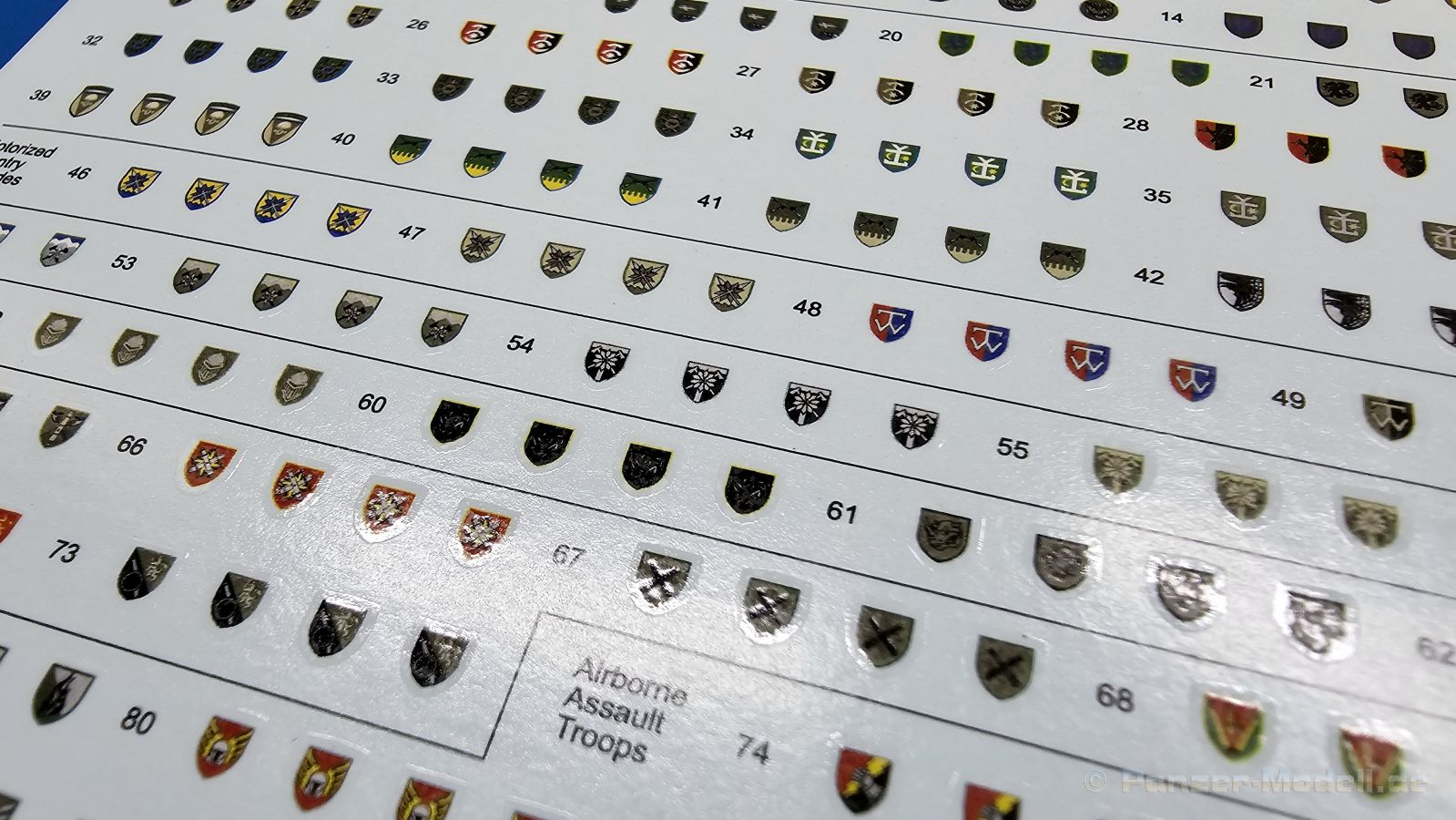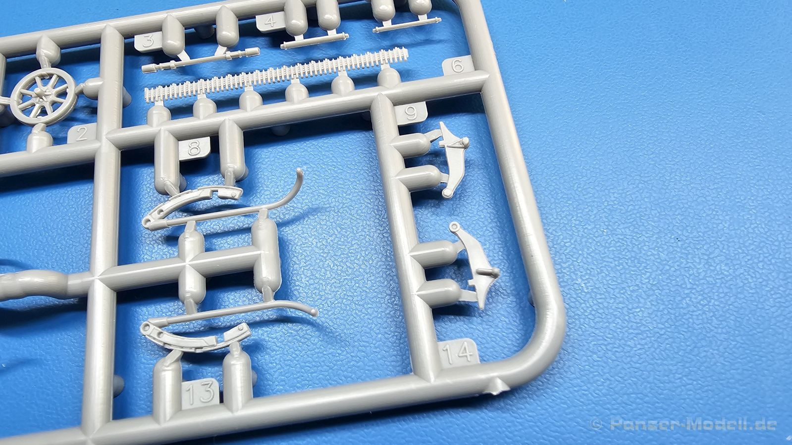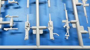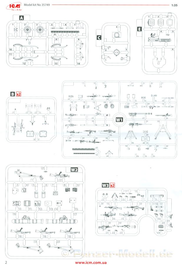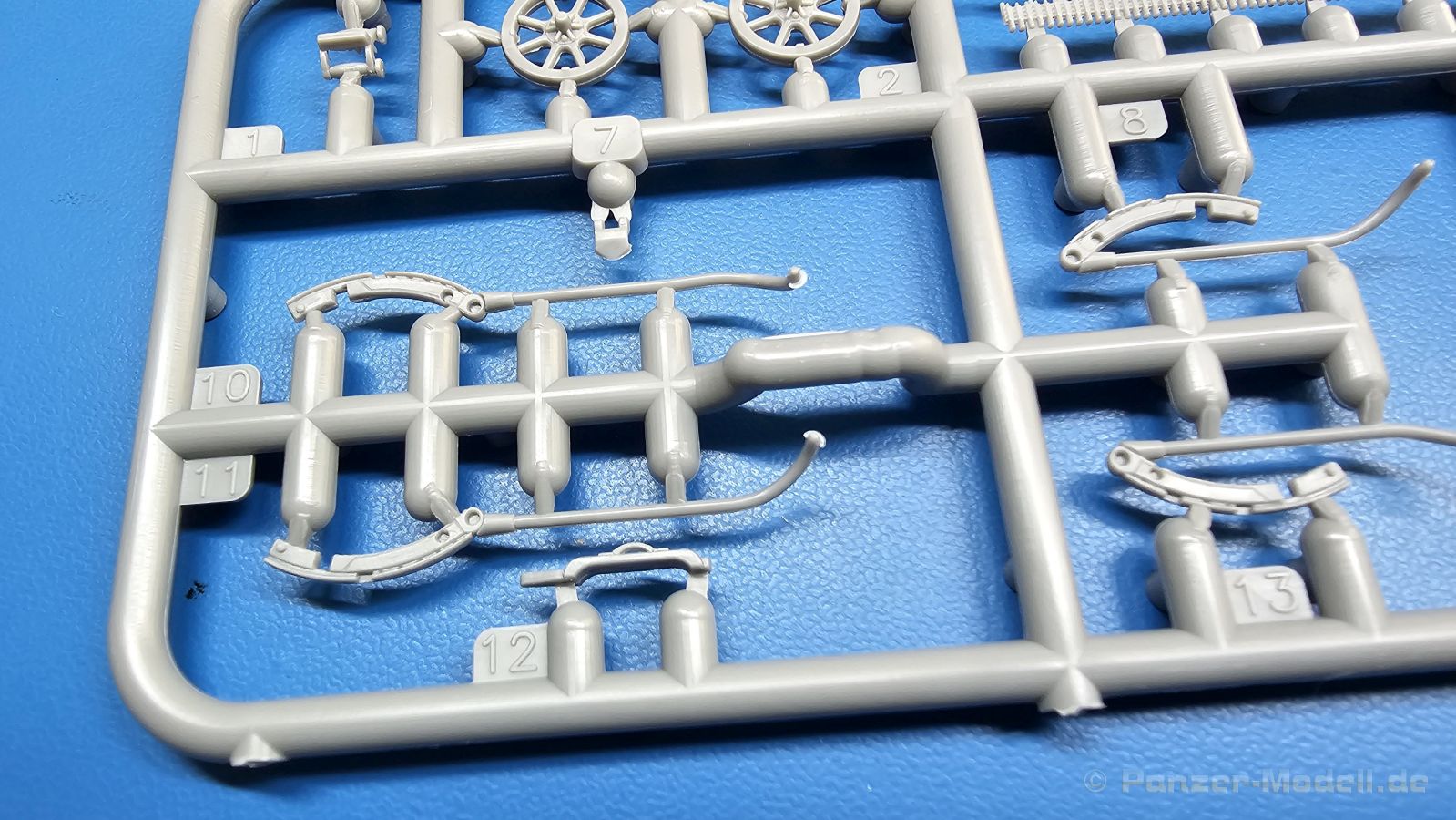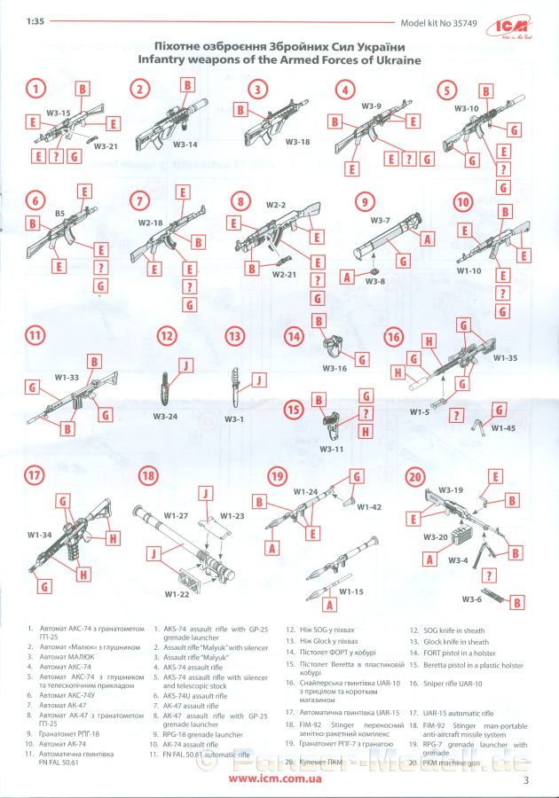 Das Original: Die ukrainischen Bodentruppen, darunter mechanisierte, motorisierte Infanterie-, Gebirgs-, Panzer- und Artilleriebrigaden, schulterten seit dem umfassenden Kriegsbeginn im Februar 2022 die Hauptlast der Verteidigung. Eine besonders aktive Rolle in anspruchsvollen Einsatzgebieten kam jedoch den Luftangriffs- und Marineinfanteriebrigaden zu. Trotz dieser enormen Belastung demonstrierten die ukrainischen Verteidigungskräfte ihre Fähigkeit zur pflichtbewussten Aufgabenerfüllung und erlangten durch ihre umfangreiche Kampferfahrung möglicherweise den Status der kampfbereitesten Armee Europas. Ihr Bewaffnungssystem stützt sich maßgeblich auf Kleinwaffen und Panzerabwehrwaffen. Die gegenwärtig eingesetzten Infanterieeinheiten verwenden dabei überwiegend Waffen aus inländischer und sowjetischer Produktion. Nennenswerte Beispiele hierfür sind die ukrainischen „Stugna“-Panzerabwehrraketen und die weit verbreiteten „Fort“-Pistolen. Spezialeinheiten greifen unter anderem auf das Sturmgewehr „Maluk“ (alias „Vulkan“) zurück. Darüber hinaus gewinnt der Einsatz von Waffen, die durch internationale materielle und technische Hilfe bereitgestellt werden, zunehmend an Bedeutung. Der Bausatz: Viele Bausätze von ICM sind durch den noch anhaltenten Ukraine Krieg geprägt. So auch das heutige Set, das im Einsatz befindliche Waffen und Zubehör der ukrainischen Streitkräfte beinhaltet. Der Karton mit Klappdeckel und farbigem Stülpdeckel ist 260 x 190 x 35 mm groß. Der Inhalt besteht aus 9 grauen Spritzlingen, einem recht großen Naßschiebebilderbogen und einer Bauanleitung. Die Teile sind sauber gespritzt, mit vielen Details. Auswerfer wurden aufgrund der Natur der Teile fast ausschließlich auf die Giessäste gesetzt, so dass die Teile unbeeinflusst sind. Viele Teile kommen mit einem Anguss aus, welches Nacharbeit spart. Hier und da ist feiner Grat, bzw. Formtrennnähte zu sehen. Es gibt 26 verschiedene Waffen und Beobachtungsdrohnen, die namentlich auch in der Anleitung benannt werden. So stellt man fest, dass es sich nicht nur um Waffen aus den sowjetisch/russischen und ukrainischen Arsenalen handelt, sondern auch um ausländische aus Unterstützungslieferungen. Viele bestehen aus nur einem Teil, welches der Detailierung aber keinen Abbruch tut. Die FORT und Beretta Pistolen kommen im Halfter daher, die SOG und Glock Kampfmesser im Schaft. Die größeren Waffen wie das UAR-10 Scharfschützengewehr, das PKM Maschinengewehr und das Beretta MG42/59 (italienischer Nachkriegsnachbau des MG42) werden mit Zweibein (eingeklappt oder aufgestellt), Griff, Munitionskasten und -gurt ergänzt. Auch das AK-47 mit Granatwerfer, der RPG-18 Granatwerfer, das Stinger Flugabwehrsystem und die RPG-7 Panzerfaust werden mit weiteren Teile ausgestattet. Für die RPG-7 liegt sogar noch eine weitere Rakete bei. Es gibt aber auch genug Bastelspaß im Karton. Das M2 Browning kommt mit 3-Bein, Munitionskasten und -gurt. Abfeuerungs- und Spanngriffe kommen separat daher. Auch der AGS-17 Granatwerfer kommt mit einem mehrteiligen Dreibein. Der Werfer selbst besteht aus zwei Hälften, so dass eine offene Mündung entsteht. Das Trommelmagazin ist zweiteilig. Fast fühlt man sich in Krieg der Welten versetzt, denn auch das rückstoßfreie SPG-9 Leichtgeschütz und das Stugna-P Panzerabwehrsystem kommen auf Dreibeinen daher. Das SPG-9 kommt mit zwei Hälften und geöffneter Mündung daher, Zieloptik und weitere Griff sind einzeln anzubauen. Das Stugna-P ist weit komplexer aufgebaut und besteht aus 18 Teilen. Dazu gehört auch eine aufgeklappte Bedienkonsole. Nur die Drähte muss man selbst hinzufügen. Am meisten hat man mit dem 1. Weltkriegs-Veteran zu tun, dem Maxim MG. Hier hat man nicht nur das MG, sondern auch das Transportgestell mit Speichenrädern, Schutzschild, Munitionskasten und -gurt. Den Zuggriff des Transportgestells kann man wahlweise nach hinten aus- oder nach vorn eingeklappt bauen. Den Sprung in die Moderne schaffen die zwei Kameradrohnen mit vier Zweiblattpropellern und Tragekoffer, aber ohne Fernbedienung. Als kleine Zugabe erhält man noch moderne Helme, die sich an den beiden W2 Spritzlingen befinden, aber sonst keine Erwähnung finden. Das Waffenset wäre allein schon toll, aber ICM legt noch einen großen Naßschiebebilderbogen mit ukrainischen Uniformabzeichen bei. Enthalten sind Einheitswappen für die Ärmel, Dienstgradabzeichen für die Schulterklappen vom Soldaten bis zum Oberstleutnant, Blutgruppeabzeichen und Ärmelflaggen. Die Bauanleitung im A4 Format hat 8 Seiten und ist in schwarz-weiß mit farbigen Akzenten gehalten. Erklärungen sind in Ukrainisch und in Englisch gehalten. Auf der ersten Seite finden sich Informationen zu den Waffen, Symbolerklärungen und eine Farbliste nur für ICM Farben, aber der Hersteller stellt auf seiner Seite eine Farbübersicht mit Konvertierungstabelle zur Verfügung. Die Spritzlingübersicht ist auf Seite 2, gefolgt von einer Übersicht von 20 Handwaffen. Hier werden ggfs. noch weitere Anbauteile und die Bemalungen angegeben. Auch wird jede der 20 Waffen namentlich genannt. Der Bau der komplexeren Waffen wird auf drei Seiten erklärt. Hier gibt es je nach Waffen 3 bis 11 Bauschritte, die aus meiner Sicht leicht verständlich sind. Die letzten beiden Seiten sind den Naßschiebebildern gewidmet. Für jedes Wappen wird die Einheit angegeben, die Dienstgrad- und andere Abzeichen benannt. Das Set ist eine gute Ergänzung für ukrainische Fahrzeuge und Figuren. Grad der Naßschiebebilderbogen wird willkommen sein, da die Figuren-Sets von ICM meist ohne Uniformabzeichen kommen. Der Preis in Deutschland schwankt erheblich zwischen 17 und 22 Euro.