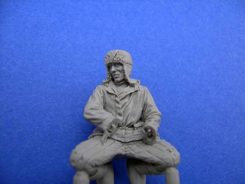 Das Gewehr ist übrigens ebenfalls sehr schön und fein detailliert dargestellt. Eine kleine Base aus Resin für die Präsentation liegt bei. Auf ihr sind bereits Abdrücke von Stiefeln und Kettenspuren modelliert. Die feinen Details der Figur wie z. B. der Pelzkragen an der Jacke, das Kabel für die Panzerschutzhaube, der "fiese" Gesichtsausdruck, der Faltenwurf an der Kleidung und Ausrüstung...