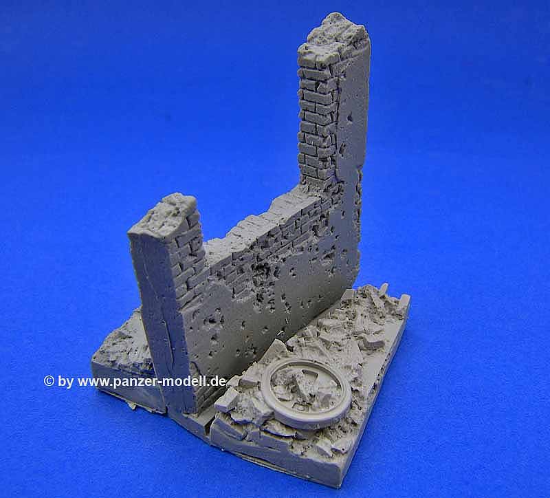Imperium, ein in Deutschland relativ unbekannter Hersteller aus Russland bietet wahrhaft hochwertige Resinfiguren in bester Gussqualität an. Das hier vorliegende Set Nummer 3515 - "The russian spezial troops in fight" beinhaltet eine actionreiche Szene. Zwei Soldaten überwinden im Sprung einen kleinen Ausschnitt einer Gebäuderuine. Die Vignette mit der Hausruine aus Resin besteht aus der zerstörten Hausmauer und je einem davor und dahinter liegenden Schutthaufen in dem Steine, Bretter, Geröll und eine Laufrolle eines Panzers enthalten sind.
