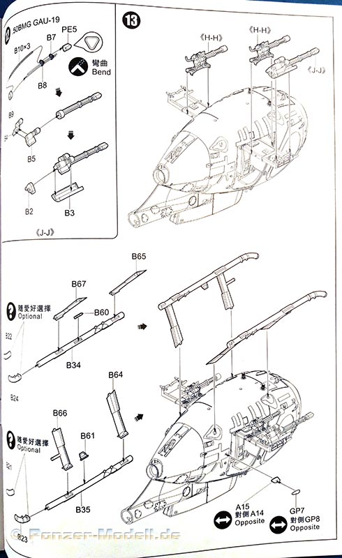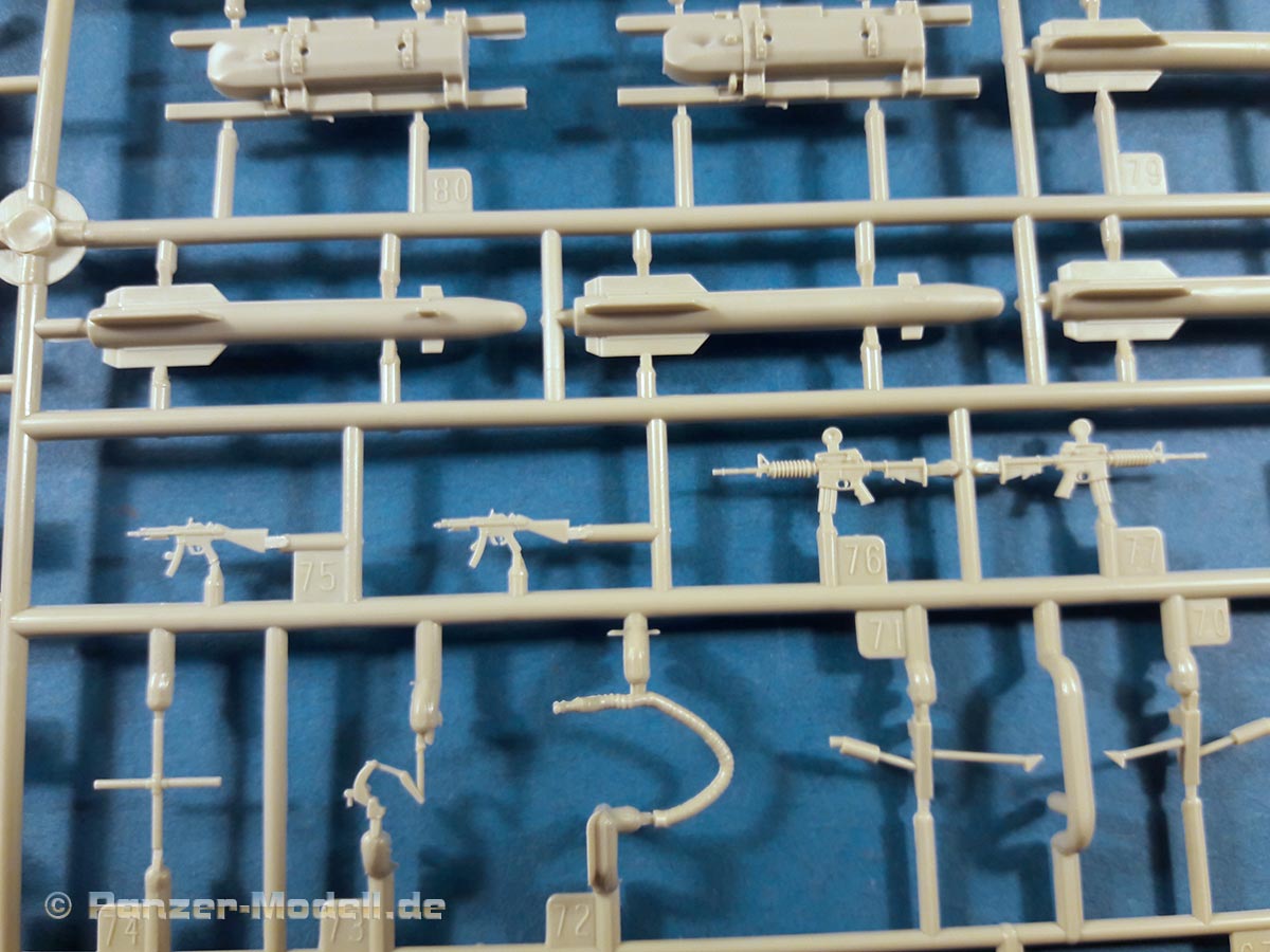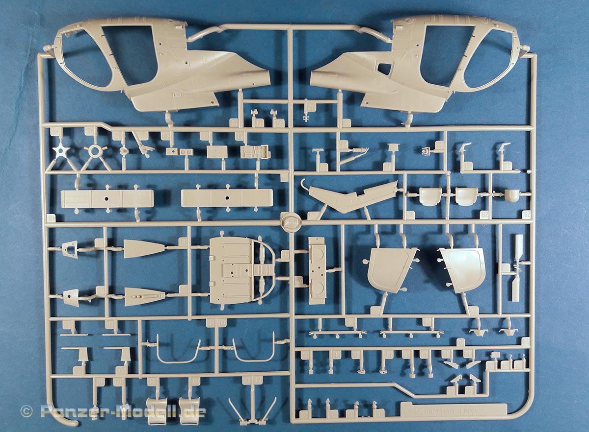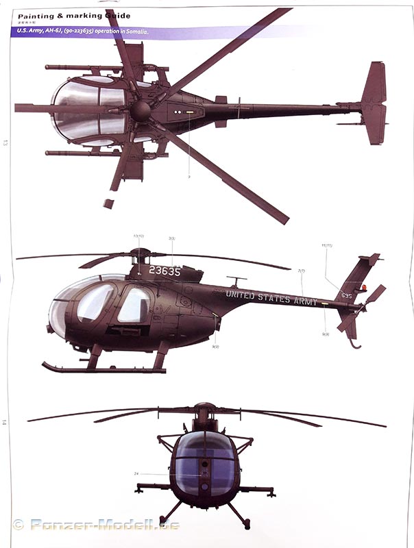 Der Hughes OH-6 wurde in den frühen 60er Jahren als extrem manövrierfähiger, leichter Aufklärungshubschrauber für das LOH Programm der US Army entwickelt. Die Version MH-6 Little Bird ist für spezielle Militäroperationen modifiziert und bietet auf jeder Seite des Rumpfes eine Sitzplattform, auf der je drei Soldaten Platz finden können. In der Passagierkabine, die Platz für zwei bis drei Personen bietet, befinden sich die Elektronik, Zusatztanks und weiteres Missionszubehör. Diese Variante wurde für das Hubschrauberregiment des US Army Special Operations Command (160th SOAR) entwickelt. Nach dem Dragon Modell von 1995 kommt jetzt ein zeitgemäßer Bausatz des kleinen und wendigen Hubschraubers. An drei sauber gespritzten grauen Gussästen und einem klaren Gussast finden sich feine und teilweise filigrane Bauteile. Auswerfermarken an später sichtbaren Stellen und Fischhaut sucht man hier vergebens. Zwei der Gussäste sind für den Hubschrauber selber und ein Gussast beinhaltet die Bewaffnung (inklusive Sturmgewehre). Für die Bewaffnung liegen 2 Ätzteilplatinen zur Verfeinerung bei - Halterungen für die Revolverkanonen und Gurtzuführer. Die Gravuren des Modells sind sauber ausgeführt und überzeugen auf ganzer Linie. Das Modell enthält eine komplette Darstellung des Triebwerkes, welches auch offen präsentiert werden kann. Ideal für Dioramenbauer. Ein Highlight sind sicher auch die Rotorblätter, welche schon einen realistischen Durchhang zeigen. Die Bauanleitung führt in 23 Schritten zum fertigen Modell. Ein Diagramm für die möglichen Bewaffnungsoptionen ist ebenfalls vorhanden Vorbildlich. In der Mitte der Bauanleitung finden sich vier Bemalungsanleitungen auf ausklappbaren Seiten Perfekt. Mit den beiliegenden Decals lassen sich 3 Maschinen aus dem Einsatz in Somalia am Anfang der 90er Jahre darstellen und einen Maschine ist nur mit 160th SOAR betitelt. Fazit: Ein sehr schönes Modell dieses kleinen Hubschraubers im richtigen Maßstab Absolute Kaufempfehlung.
