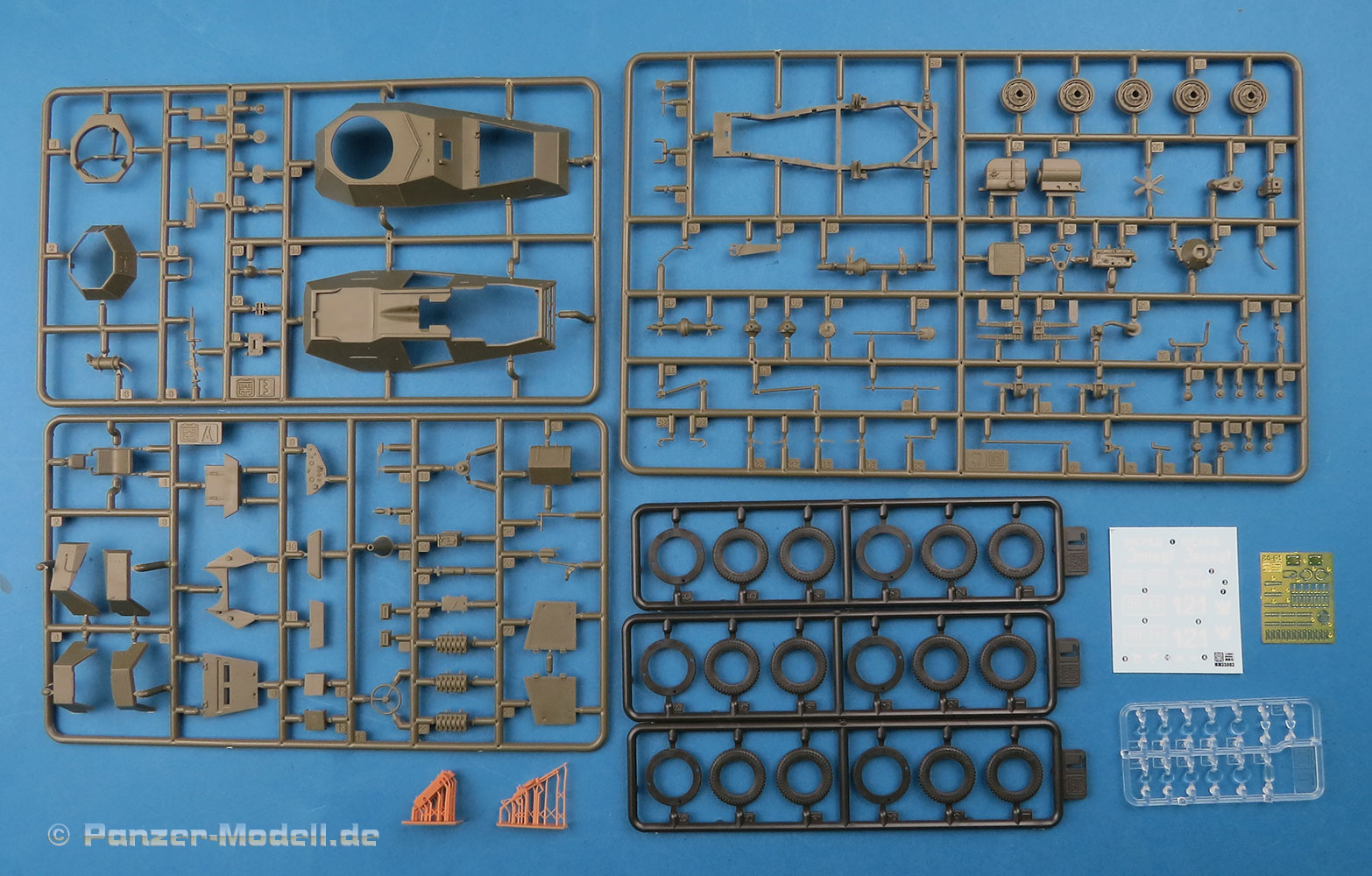 Im Bausatzkarton finden wir 3 olive und 3 schwarze Spritzlinge, ein transparenter Spritzling, zwei 3D Druck Teile, eine kleien PE Platine und ein Decalbogen.