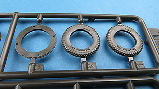 Die Räder isn in Scheibenbauweise und setzen sich aus 3 Scheiben plus Felge zusammen. Die Detaillierung ist gut und durch die Bauweise wird das Profil recht ansprechend dargestellt. Die Reifenflanken weisen Herstelleraufdrucke auf, wobei mir diese zu erhaben scheinen - aber das kann man notfalls runterschleifen