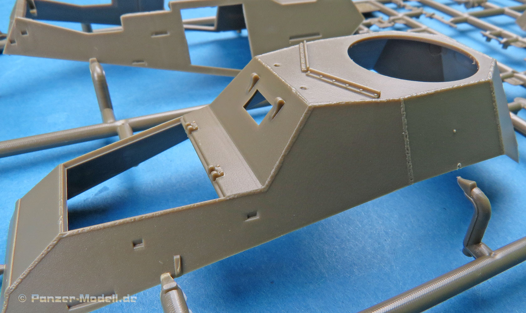 Die Oberwanne ist ebenfalls grundsätzlich einteilig und wird mit Sichtluken, Kotflügeln, Ersatzrad und anderen Kleinteilen außen und Armaturen und Lenkrad innen vervollständigt. Die Schweißnähte sehen ganz gut, wennauch vielleicht etwas zu aufgetragen. Die Motorraumklappe liegt einzeln bei und so kann man diese auch offen oder geschlossen anbauen.