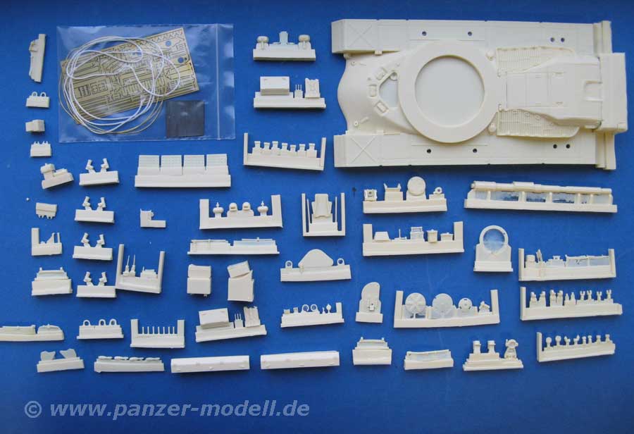 Im Karton finden sich neben einer komplett neuen Oberwanne mit hochgezogenem Motordeck und dem komplett neuen Turm mit sämtlichen Anbauteilen. Viele der Teile sind bereits aus den A1 und A2 Umbausätzen bekannt und in gleich guter Qualität vorhanden. Die Oberwanne weist gelegentlich ein wenig Schrumpfung oder minimalsten Verzug auf, der sich aber entweder nicht auswirkt oder unter heissem Wasser schnell behoben ist. Die kettenbleche erscheinen allerding seine Idee zu schmal.