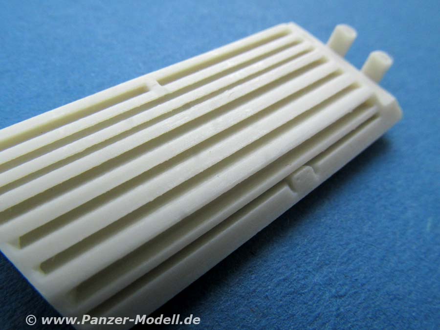 Diese Teile stellen die Auspuffgitter der Leoparden in Strangpressprofilbauweise dar und ersetzen die teilweise mäßig bis schlecht detaillierten und mit zuwenig Tiefe versehenen Bausatzteile der gängigen Hersteller. Ausserdem stellen diese resinteile endlich die tatsächlichen Maßverhältnisse der Stränge dar, denn an allen Spritzgussmodellen sind diese einheitelich und mit gleichem Abstand, was am Original aber nicht der Fall ist, plus der kleinen Verbindung oben und den beiden untersten Lamellen.