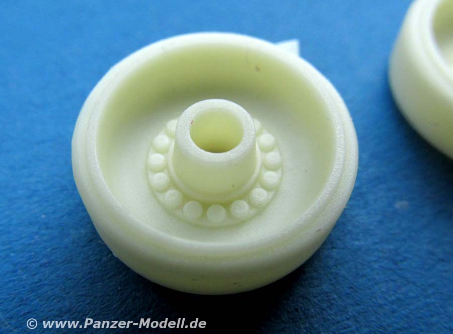 Der Guss der Resinteile ist exzellent mit fein abgegrenzter Gummibandage und vor allem sauberen und detaillierten Radnaben und Sicherungsmuttern.