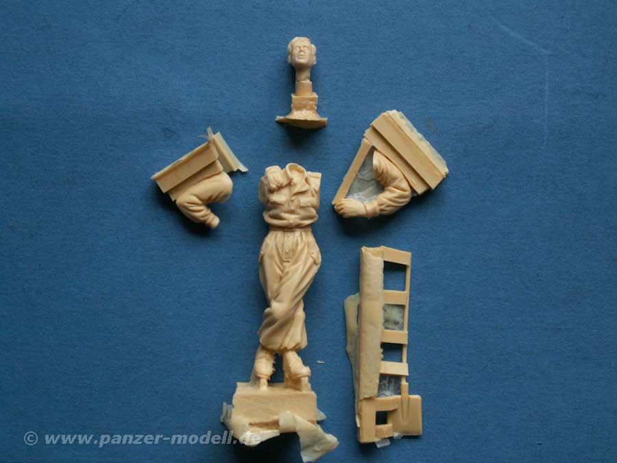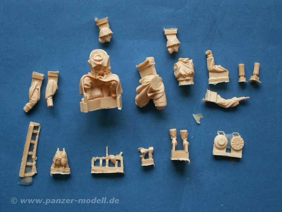 Enthalten sind zwei Figuren, die sehr gut und sehr detailiert in Resin gegossen sind. Neben den Körperteilen der Figuren, die in mehrere Teile aufgebrochen sind, um den maximalen Detailierungs- und Hinterschneidungsgrad zu erreichen, sind auch diverse Zubehörteile enthalten, wie Karabiner, Panzerminen, Gasmaskenbehälter und Essgeschirr.