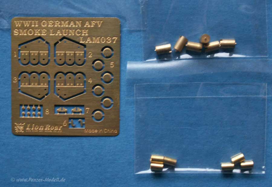 Die PE Platine enthält die Halterung für die Nebelbecher jeweils für Tiger I, Panther D, Panzer III M/N, Panzer IV G und StuG III G auch mit entsprechenden Turmhaken, wenn diese mit integriert waren.