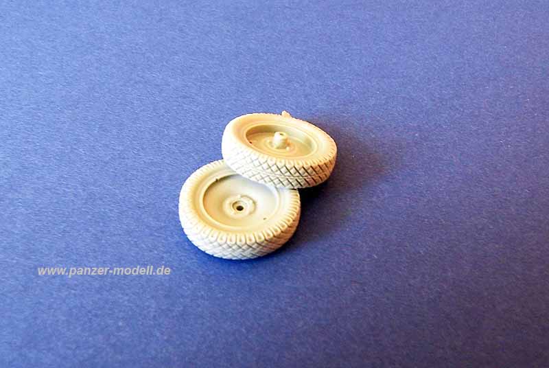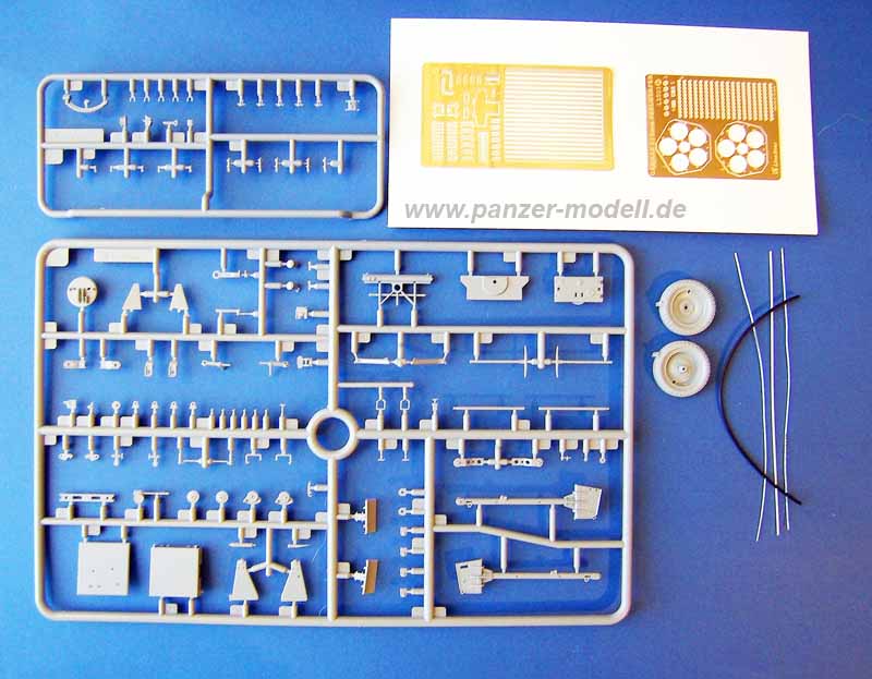 Die Kunststoffteile sind in Spitzenqualität gearbeitet. Absolut sauberer, scharfer Guss, keine Gratbildung, sehr schön detailliert. Die Räder sind mit ihrem fein detaillierten Profil ein echtes Highlight. Auch die Werferrohre aus Messing sind wunderbar gearbeitet, sehr dünnwandig und mit feinsten Bohrungen und Schlitzen versehen. Die elektrischen Zündleitungen für die einzelnen Rohre sind aus dem beiliegenden Draht anzufertigen. Der Kunststoffschlauch wir zur Darstellung der elektrischen Abfeuerungseinrichtung verwendet.