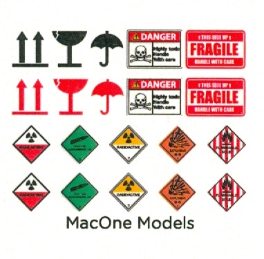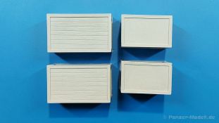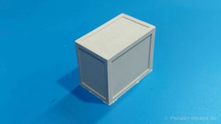 Unter dem Titel „Small wooden boxes“ bietet uns der spanische Hersteller MacOne vier Holzkisten in Resinguss. Die Teile sind massiv, scharf, sauber und blasenfrei ohne Angussstück gegossen. Das Versäubern kann sich auf die unteren Kanten beschränken, aber bei dem feinen Grat gibt es kaum was zu tun. Die beiden größeren Kisten stellen Bretterkisten mit Kantenverstärkungen dar. Sie sind 42 x 25 x 22 mm (LxBxH) groß, welches 1470 x 875 x 770 mm im Original entspricht. Nur die Unterseite ist undetailliert. Alle anderen Seiten zeigen schön die Kantenverstärkungen, die Bretter die Maserung des Holzes. Holzplattenkisten mit Randverstärkungen stellen die beiden kleineren dar. Sie sind 32 x 20 x 27 mm groß, 1120 x 700 x 945 mm im Original. Wie bei den großen Kisten sind 5 Seiten detailliert, wenn man davon sprechen kann. Die Randverstärkungen sind scharf ausgebildet, die auf den ersten Blick glatten Seiten zeigen dennoch im Licht eine Struktur, die an Faserplatten erinnert. MacOne packt einen kleinen Bogen Naßschiebebilder bei, die je eine Kistenmarkierung in Schwarz und je eine in Rot (senkrecht transportieren, vor Feuchtigkeit schützen, Vorsicht zerbrechlich) und je zwei in Englisch „Gefahr giftig“, „Senkrecht transportieren-Vorsicht zerbrechlich-vorsichtig behandeln“) enthalten. Ebenso sind Gefahrgut-Label (Radioaktiv, Explosiv, Entflammbar, nicht entflammbares Gas) enthalten. Die Decals sind sauber und scharf gedruckt, ohne überstehenden Trägerfilm. Die Kisten können als Ladegut oder Ausschmückung in einem Diorama verwendet werden. Mit den Markierungen datieren sie mehr in die heutige Zeit, ohne sind sie relativ zeitlos. Der Preis in Deutschland liegt um die 8,- Euro.