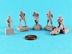 Erneut werden die 1:72er Modellbaufreunde mit einem sehr schönen Set Figurenset von Macone bedacht.. In der Blisterverpackung befinden sich insgesamt vier komplette Figuren sowie zwei Halbfiguren. Dazu kommen noch zwei Waffen mit angegossenen Händen. Drei der Kamaraden stehen in relativ universellen, legeren Haltungen da, während eine Weitere in knieender Position dargestellt ist. Die Halbfiguren sind von der Pose für die Bestückung eines Panzers ausgelegt. Der Guß der Resinfiguren kann für diese Größe durchaus überzeugen. Der stellenweies vorhandene Grat sollte sich auf jeden Fall schnell beseitigen lassen. Auch die Gesichter sind sehr gut definiert dargestellt. Mützen, Stahlhelme, Panzerschutzhauben, alles passt. Auch der Kopfhörer des Pz-Kommandanten wurde nicht vergessen. Details, die teilweise erst mit einer Lupe zum Vorschein kommen. Schön gemacht z.B. auch die Hände bei denen man die einzelnen Finger klar erkennen kann. Ausrüstungsgegenstände gibt es hier nicht, dafür können aber Hosen und Jacken u.a. mit dem Faltenwurf überzeugen. Auf zwei Stegen werden noch ein Gewehr und eine MP mitgeliefert an denen die Hände angegossen sind. Jedenfalls hat Macone einen feinen Job gemacht und ein Set herausgebracht das durchaus seine Anhänger finden wird. Im übrigen sehen die Figuren auch in diesem Fall real besser aus als auf den Fotos…