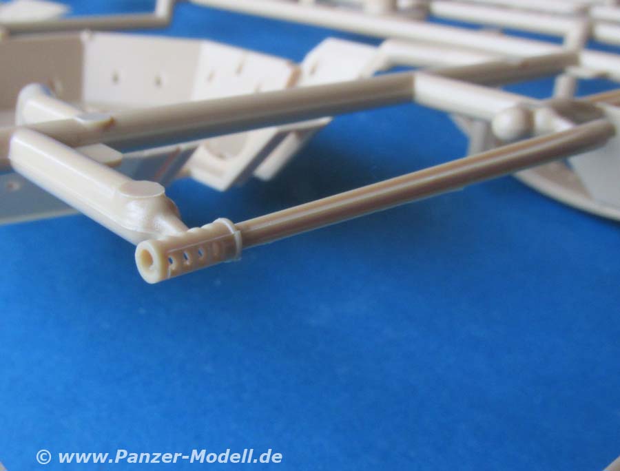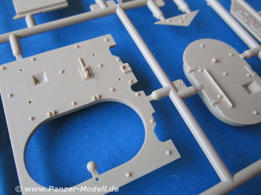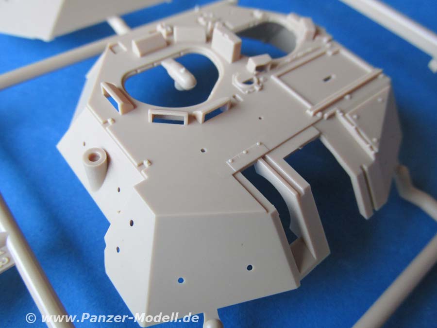 Der Turm ist ebenso wie die Wanne fein detailliert und sauber gespritzt dargestellt. Auch hier lassen sich alle Luken öffnen. Das Kanonenrohr ist ein wahres Meisterwerk, auch wenn ein kleiner Versatz am Mündungsfeuerdämpfer die Freude etwas trügt, aber die Darstellung dieser mit öffener Mündung und offenen Seitenschlitzen des Feuerdämpfers in Plastik ist schon ganz großes Kino.
