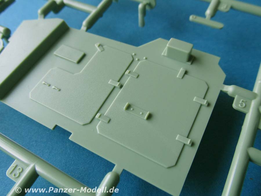 Ansonsten ist der Innenraum über den Drehstäben komplett dargestellt: Kampfraum mit Sitzbänken, Ausrüstung und den bereits erwähnten Sitzgurten, Fahrerplatz, Munitionslager, Staukisten, Turminnenleben, Funkgeräte, usw. Einfach grandios und wünschenswert, dass da noch mehr Modelle in dieser Ausstattung kommen, denn so macht es endlich mal Spaß die große Heckklappe auch offen darzustellen. Der grünliche Farbton des Plastiks unterstützt den guten Eindruck noch weiter, gibt er einem doch gleich eine gute Grundlage für die weitere Bemalung.