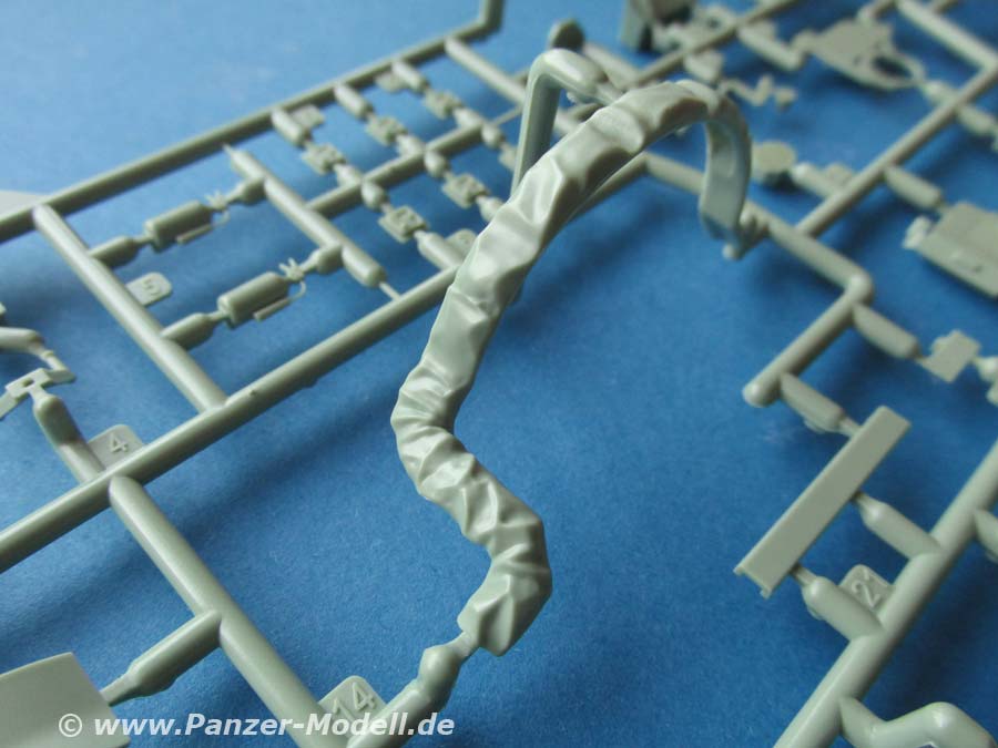 Die Kettenglieder sind immer zu zweit verbunden plus Gussnase, d.h. zwei Angüsse pro Kettenglied. Die Details der Kettenglieder sind einfach sensationell und dazu absolut ohne Auswerferstelle wie man es bei vielen anderen Herstellern beobachten kann. Diese Kettenglieder werden nach dem versäubern einfach zusammengeklickt ohne Klebstoff und bleiben damit voll beweglich - damit macht auch das einfedernde Laufwerk auch wirklich Sinn.