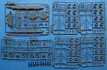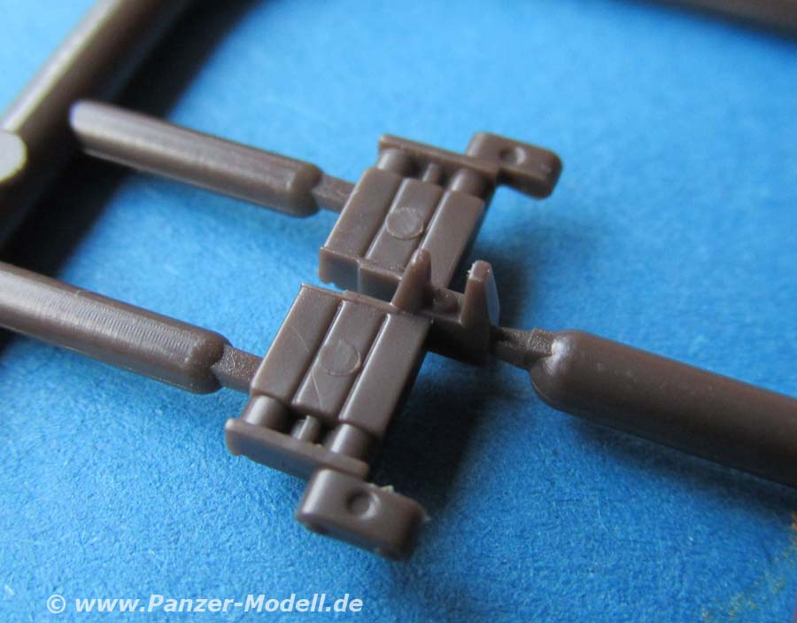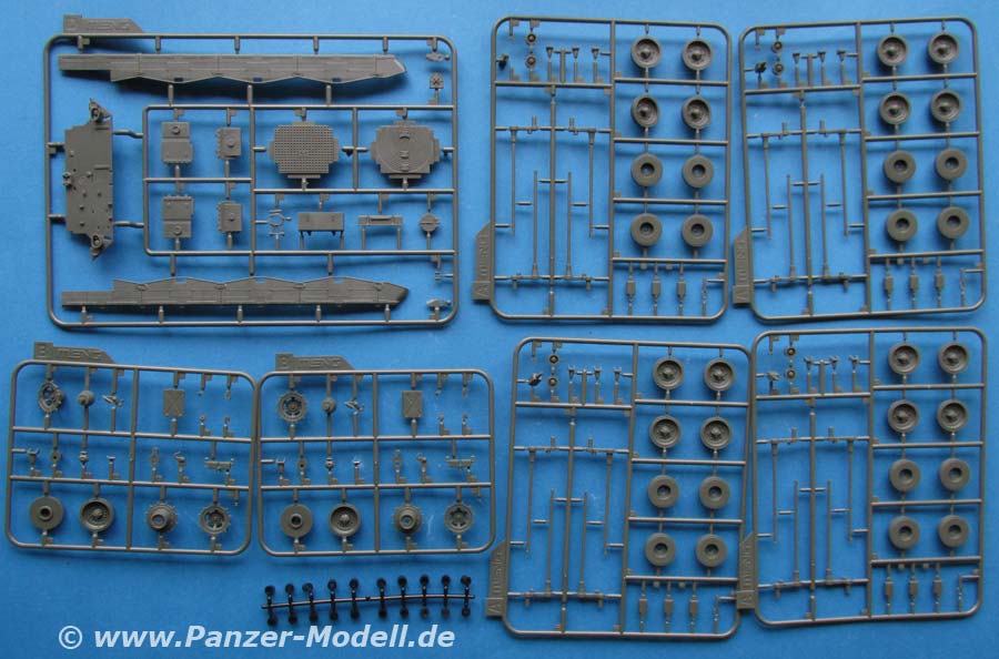 Laufrollen, Treib und Leiträder setzen sich aus zwei Teilen mit Polycap zusammen und bleiben daher später drehbar. Die Laufrollen machen auf der Aussenseite einen sehr guten Eindruck mit schönen Details der Felge und der Schraubenmuttern. Größter Pluspunkt gegenüber dem alten Italeri Modell ist zum einen die 100%ig korrekte Breite und dass die Gummierung durchlaufen und nicht mit Rillen segmentiert ist. Auf der anderen Seite ist die Innenseite der Laufrollen und Leiträder unverständlich vereinfacht gehalten und hat mit dem Original nicht das geringste zu tun. Ob sowas heutzutage noch sein muss? Andererseits auch hier die berechtigte Frage wieviel davon später am gebauten Modell von der Innenseite zu sehen ist!?