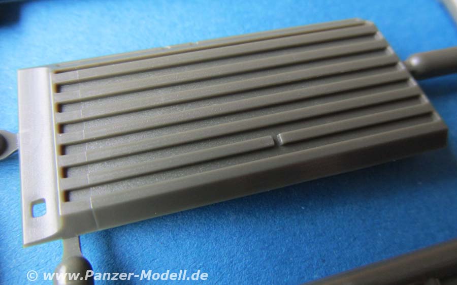 Die Oberwanne macht ebenfalls einen guten Eindruck, wobei die im Original markanten, teils mehrschichtigen Schweißnähte ein wenig unterdimensioniert erscheinen. Die Öffnung des Motorlüfters wird von unten mit einem sehr schön gemachten Plastikteils mit der Wabenstruktur des Leo 1 Lüfters versehen und es liegt sogar das passende Teil für das Tropenkit wie beim griechischen Leopard bei. Das Motorgitter selber ist aus sehr feinem PE Blech, sowohl für den Standard als auch den Tropenkit Leopard - hier muss man achtgeben, denn durch das dünne Blech neigt es schnell sich zu biegen.