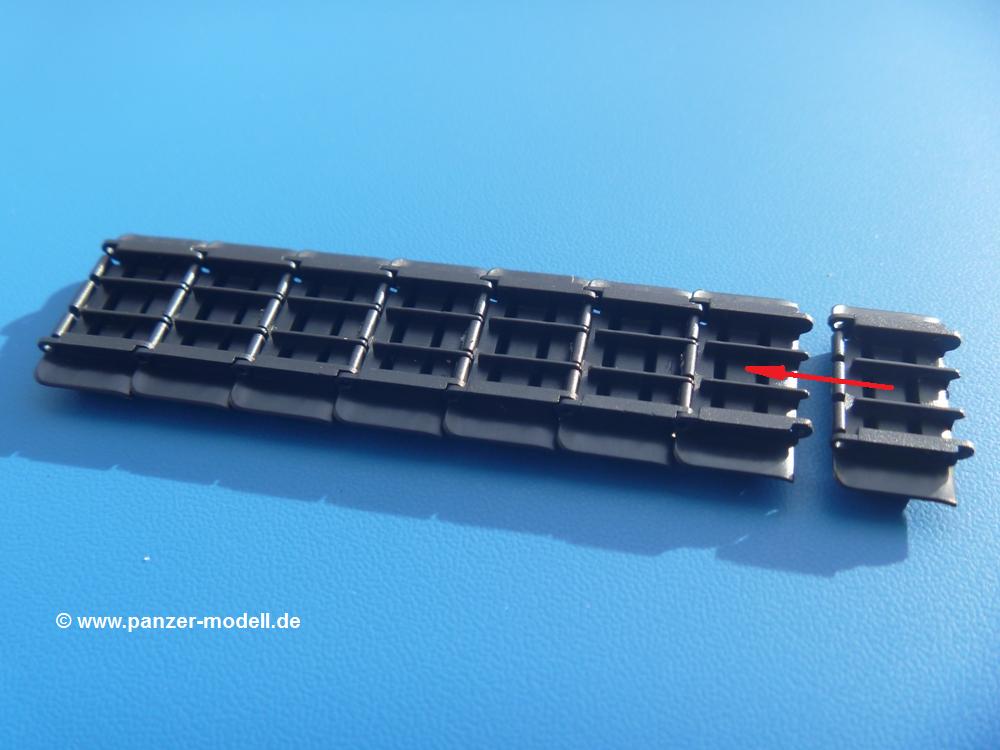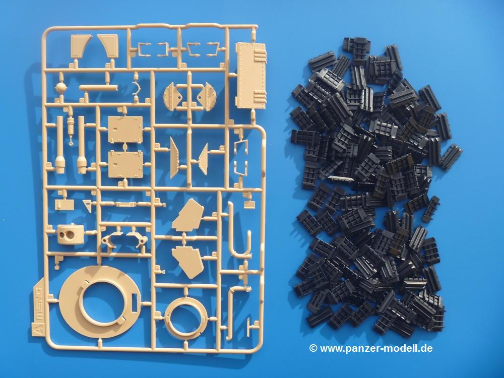 Bleibt nur noch die Kette. Keine Spritzlinge, sondern bereits einzeln in einer Tüte ähnlich den Magic Tracks eines anderen Herstellers. Hier und da sind kleine Angussnasen zu sehen, die man aber höchstens an den Gliedern entfernen muss, die um Antriebs- und Leitrad herumlaufen. Liegt die Kette gerade, sind die Nasen nicht zu sehen. Die Metallstruktur der Glieder ist fantastisch und das schwarzgraue Plastikmaterial unterstützt den Eindruck noch. Die Kettenmontage ist einfach. Die Glieder werden einfach nur zusammengeschoben, bis die Stifte des einen Gliedes in den Löchern des anderen einrasten. Die Kette bleibt voll beweglich.