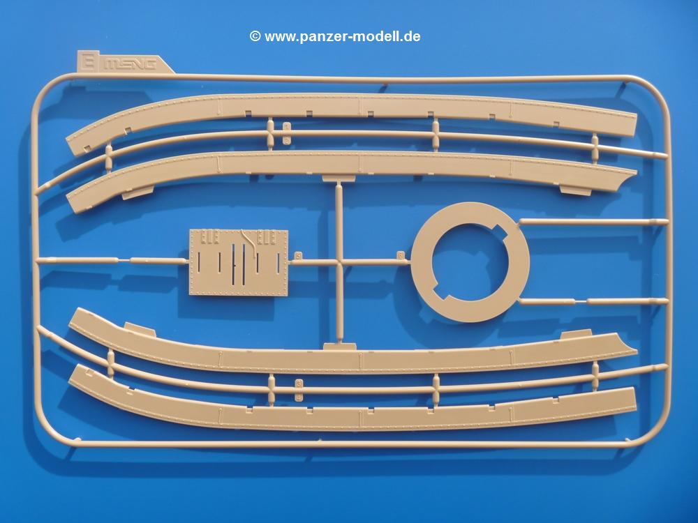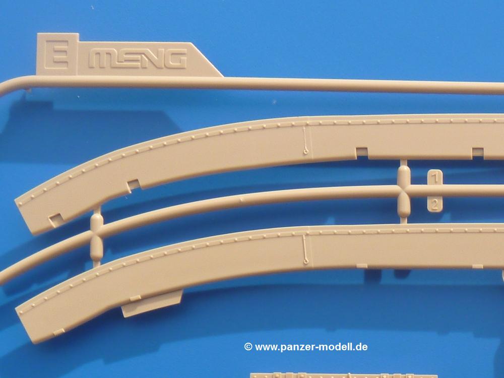 Ich denke mal, dass ich Antriebsräder, die kleinen Staukästen, die Turmluken und die großen Auspufftöpfe nicht besonders ansprechen muss. Anders ist es da bei den langen Zahnleisten, die dann die 74 (!) Laufrollenpaare pro Seite an ihrem Platz halten. Das wird allein ein Geduldsspiel mit den Laufrollen, und doch gibt es Stimmen im Internet, die sich darüber beschweren, dass Meng Model die Blattfederungen weggelassen hat. Ich konnte auf keinem Foto die Federung erkennen, auch bei abgenommenen Seitenblechen nicht, so dass ich denke, das man mit Mengs Art der Darstellung durchaus leben kann.