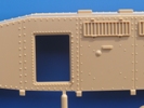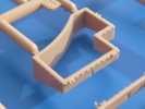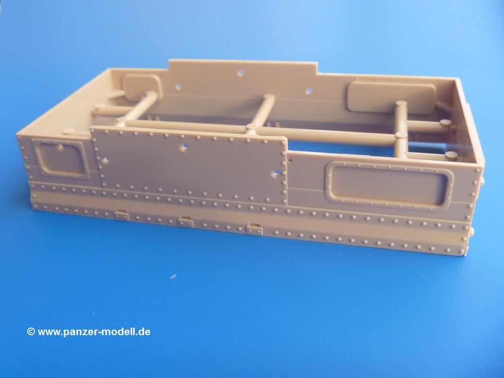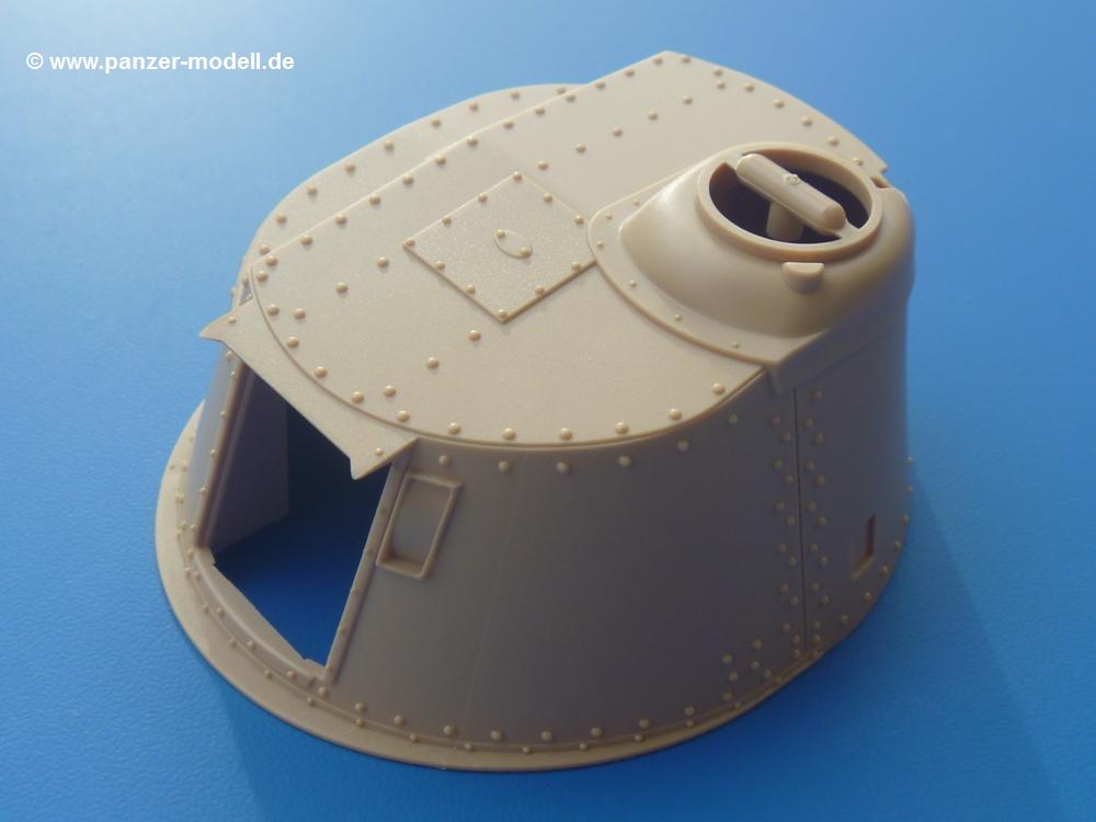 Das zweitgrößte Teil im Bausatz ist die Oberwanne mit der Aufnahme für die beiden Türme und der angegossenen Heckplatte und den Seitenvorgelegen. Ihm folgt die 8 cm breite und 26 cm lange Bodenplatte, die auch an der Unterseite brav ihre Nietenreihen zeigt. Die letzten drei großen Einzelteile sind die obere Motorverkleidung und die beiden Türme. Die Verkleidung passt 1a auf die Oberwanne. Kein Spalt, kein Spachteln! Beide Türme sprechen für sich selbst. Wie bei französischen Panzern oft zu sehen, haben die Türme neben der Dachluke auch Hecktüren, die in diesem Fall angegossen sind. Eine offene Darstellung entfällt somit, aber es gäbe in den Türmen auch nichts zu sehen.