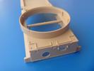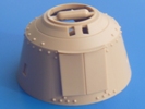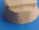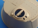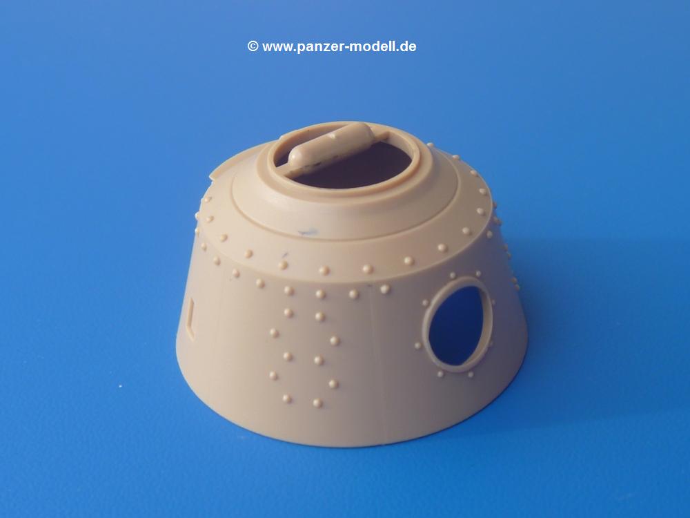 Die halbrunde Kanonenblende mit den Aufnahmen für das Rohr und den aussenliegenden Rohrvorholer/Rohrbremse zeigt angedeutete Verdickungen an den Seiten und 2 Nieten. Die seitlichen Stifte werden ihren Platz ohne Klebstoff in der Rohrwiege finden, so dass das Rohr höhenrichtbar bleiben wird.