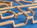 Die großen Abgasrohre sind ca. 1,5 mm am Ende ausgehöhlt. Da noch Abgasklappen draufkommen, wäre das nicht unbedingt notwendig, aber wer den 2C mit Motor in Betrieb bauen möchte, wird dies bei teilgeöffneten Abgasklappen begrüßen. Die feine Trennnaht der Spritzformen könnte man auch als Schweißnähte durchgehen lassen. Ob dies so war, kann ich leider aus den mir vorliegenden Originalaufnahmen nicht erkennen.