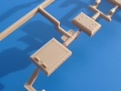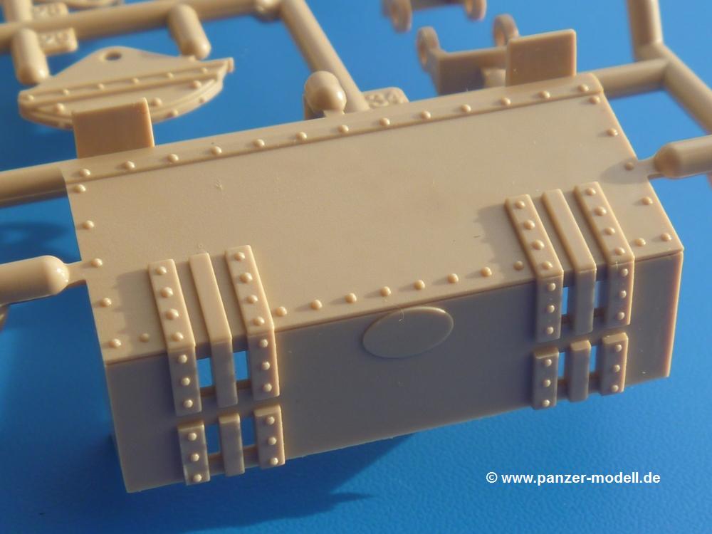 Vor dem Turm finden zwei, der Turmrundung angepasste, Staukästen ihren Platz. Die Nieten treten deutlich hervor. Allerdings gibt es auch hier eine kleine Nahtlinie der Spritzform zwischen den vielen Nieten. Dafür gibt es dann wieder sauber und schön gestaltete Scharniere an den Staukastendeckeln.