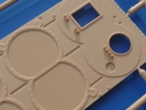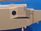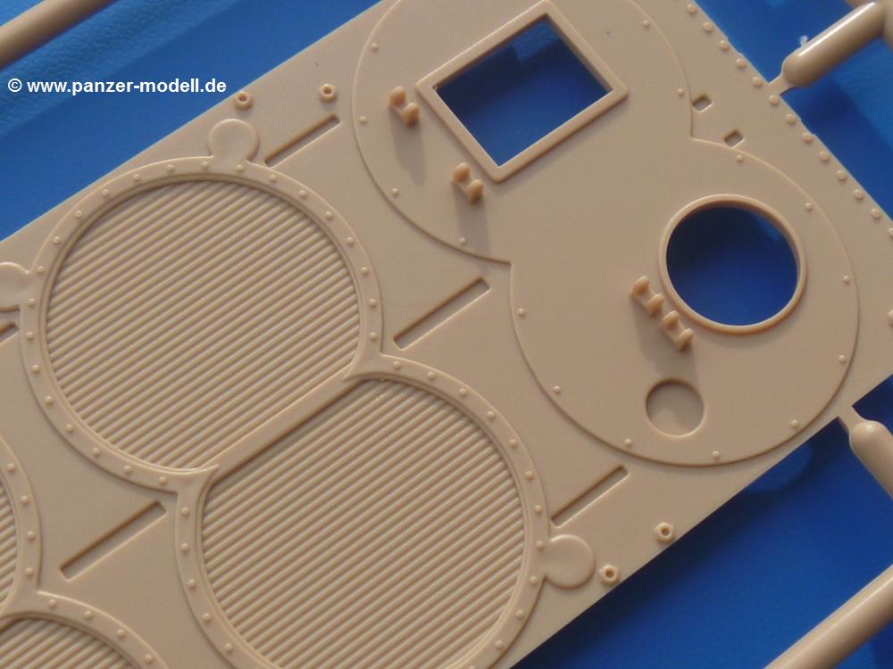 Auf der großen Motorraumplatte finden wir 4 ineinander übergehende, runde Lüfteröffnungen mit feinen Längsrillen. Diese Öffnungen werden später noch Ätzteilgitter erhalten. Die Längsrillen zwischen den Lüftern nehmen die querliegenden Aufpufftöpfe auf. Hinter den Lüftern sehen wir je eine rechteckige und eine runde Lukenöffnung mit ihren Scharnierlagern. Die Lager kommen etwas grob in der Großaufnahme rüber, aber immer noch annehmbar. man kann auch einige Sechskantschraubmuffen erkennen. Hier schließen die feinen, separaten Leitungen an, die neben den Handgriffen unter den seitlichen Lüftungsgittern, die feinsten Teile dieses Monsters sind. Kleinteilalarm aufgehoben!