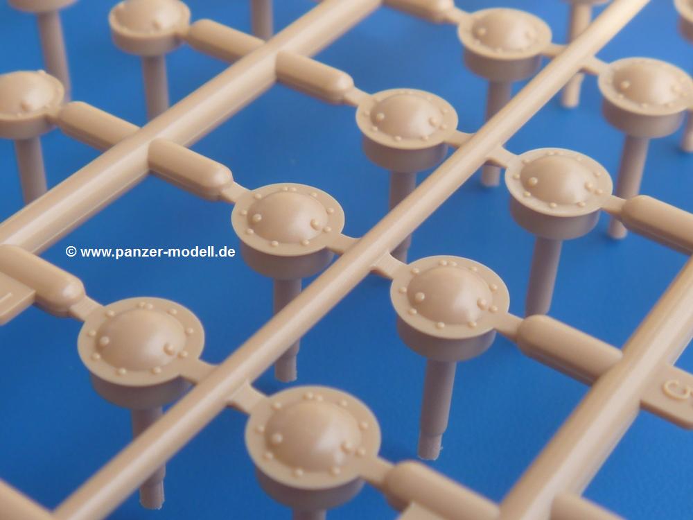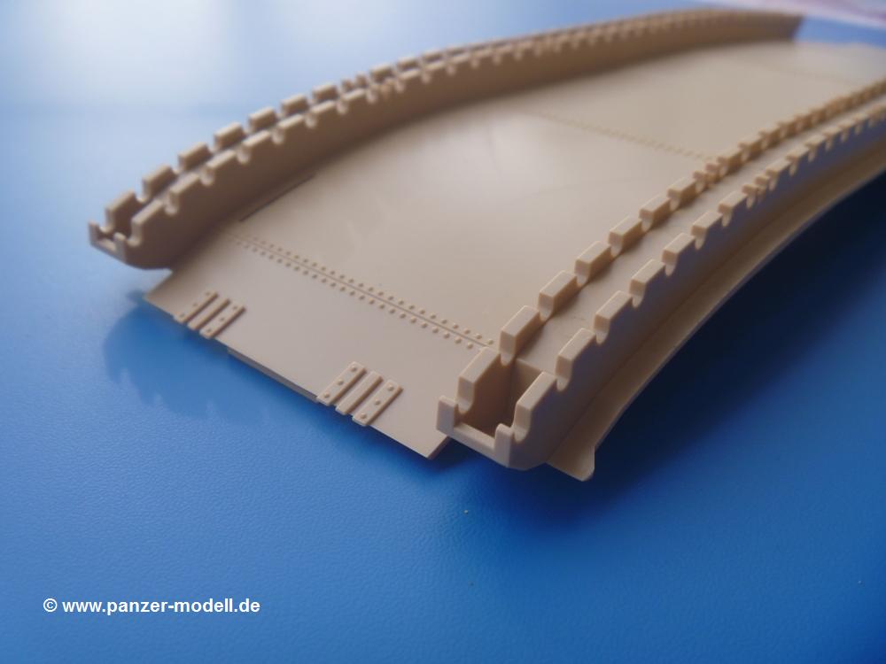 Der Guss ist ausgezeichnet. Details kommen klar zur Geltung. Formversatz gibt es nicht. Mit dem bloßen Auge fast nicht zu erkennender Grat lässt sich durch scharfes Hinschauen entfernen. Man findet keine Auswerferspuren an nach dem Bau sichtbaren Teilen. Die separaten Kettenglieder haben winzige Angussnasen, die schnell beseitigt sind. Vorsicht bei den Ätzteilgittern. Diese sind hauchdünn. Am Besprechungsmuster fand sich leider ein kleines Loch in einem Gitter.