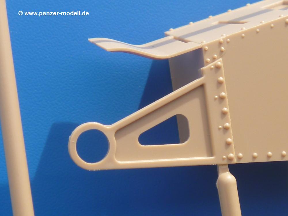 Die Bugplatte fällt durch ihre markanten Nietenreihen auf. An der Bugplatte finden wir die Aufnahmelöcher für die Augen der Bahntransporthalterung. Die ovale Platte an der Front könnte ein Herstellersiegel sein, aber es gibt keine erkennbare Struktur oder Abziehbilder dafür. Mir vorliegende Originalaufnahmen haben leider auch keine Aussagekraft.