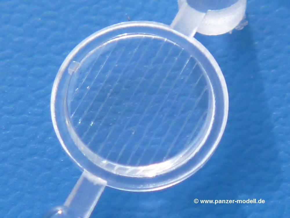 Winzig im Vergleich, aber trotzdem ein Hingucker ist das einsame Scheinwerferglas mit den feinsten Riffelungen. An seinem Platz im Scheinwerfer vor dem Turm wird es nicht zu übersehen sein.