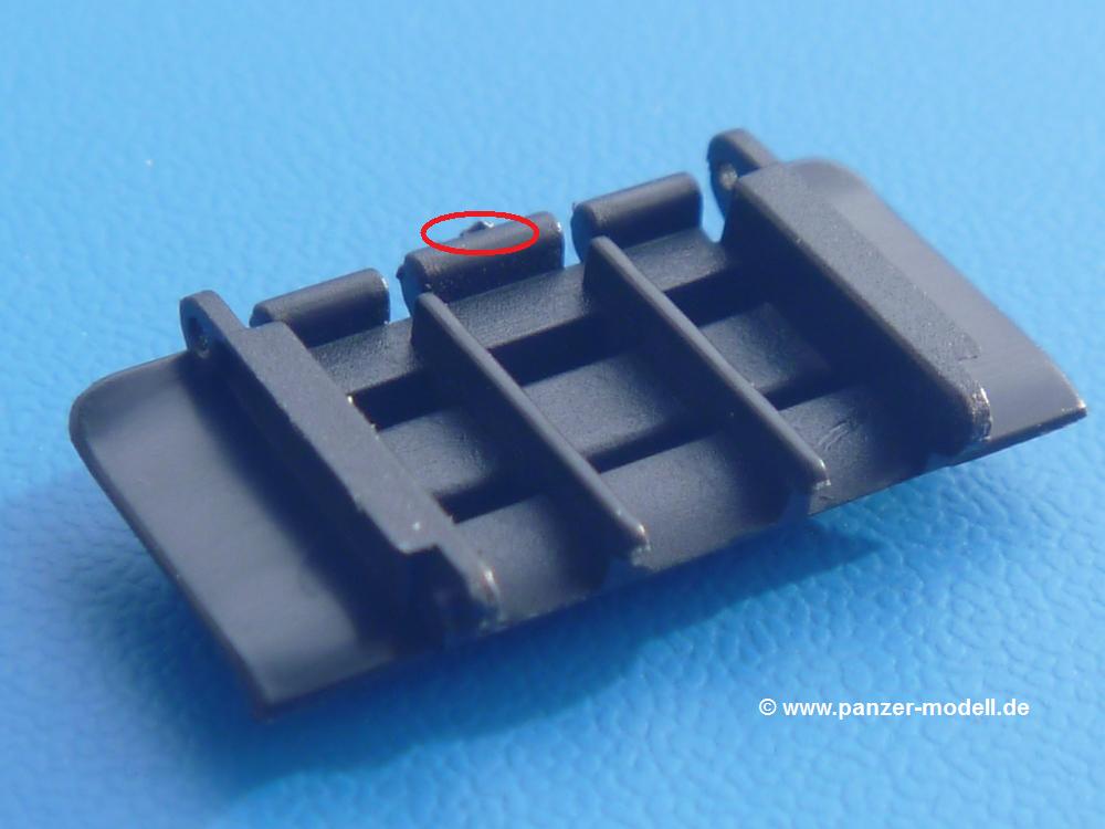 Schäkel aus einem Guss erleichtern einem die Arbeit, und sehen trotzdem gut aus. Achtung, falls man Panzer Nr. 97 Normandie bauen möchte. Am Original findet man die Schäkel an der oberen Motorverkleidung um 90 Grad nach hinten verdreht.