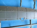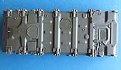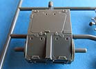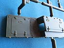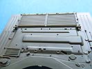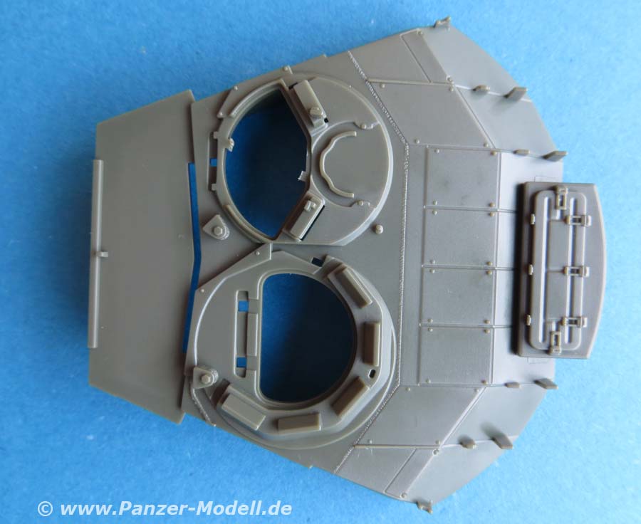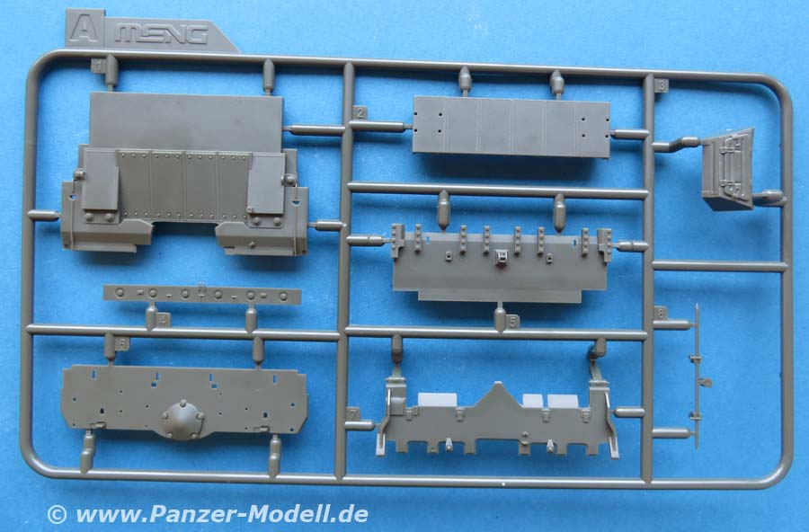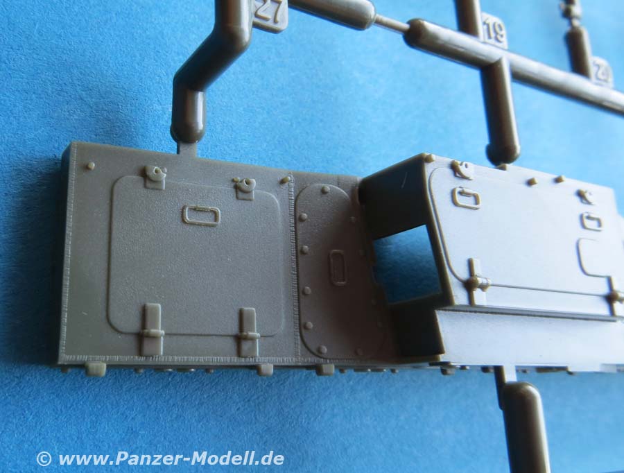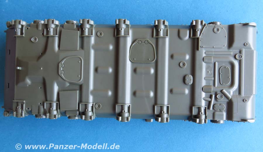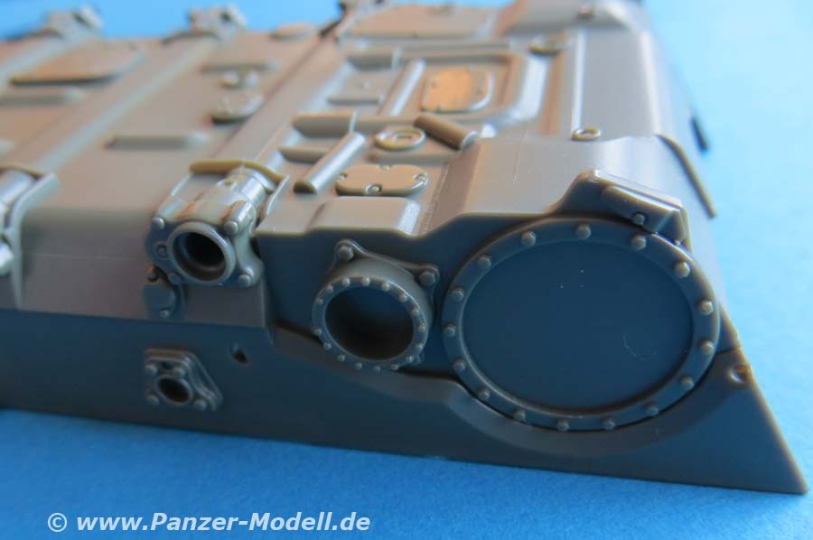 Die Zusatzpanzerungselemente für die Seiten reichen über die Ketten hinaus, sodass gar nicht das ganze Fahrwerk eingesehen werden kann. Diese Elemente sind in einem großen Bauteil zusammengefasst. Am Wannenheck gibt es eine entsprechende SLAT Armor Einheit.