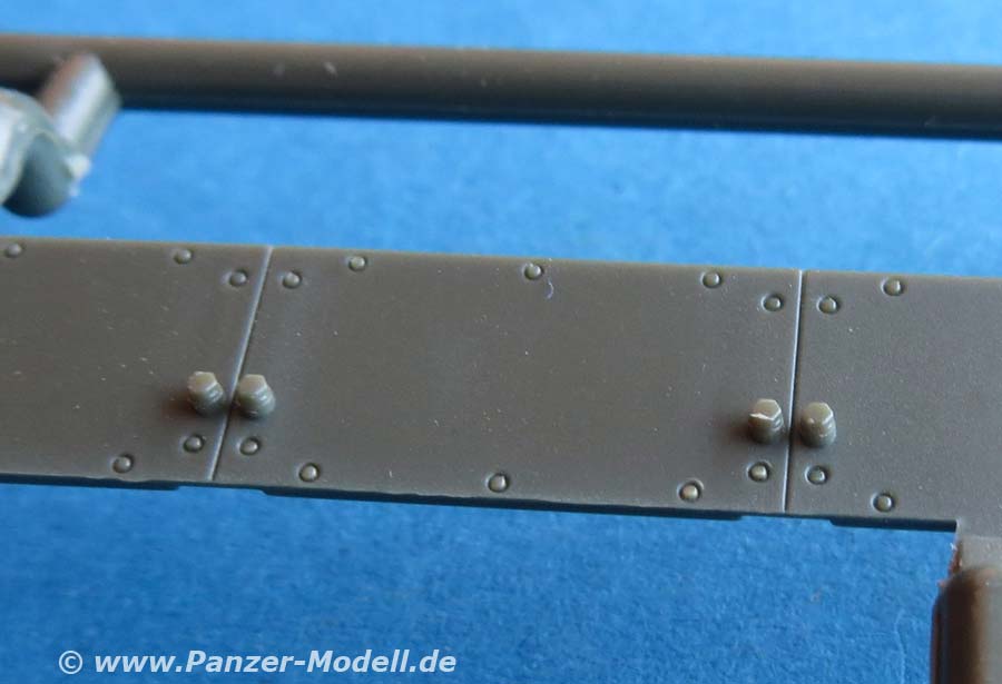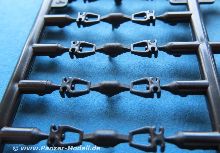 Das letzten großen Anbauteil gibt es dann an der Wannenfront, denn es liegt zusätzlich das EMT Anti-Minensystem, das mit relativ wenigen, aber schön gemachten Bauteilen. Für den Bereich der Ketten ist eine entsprechend herunterklappbarer Minenpflug dabei.
