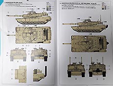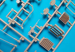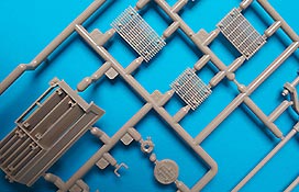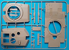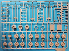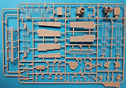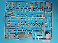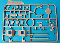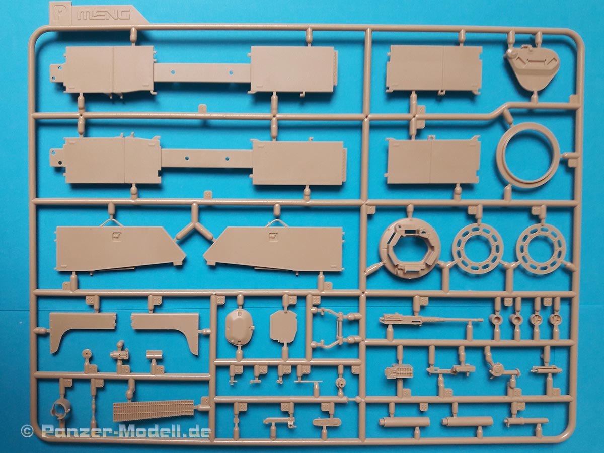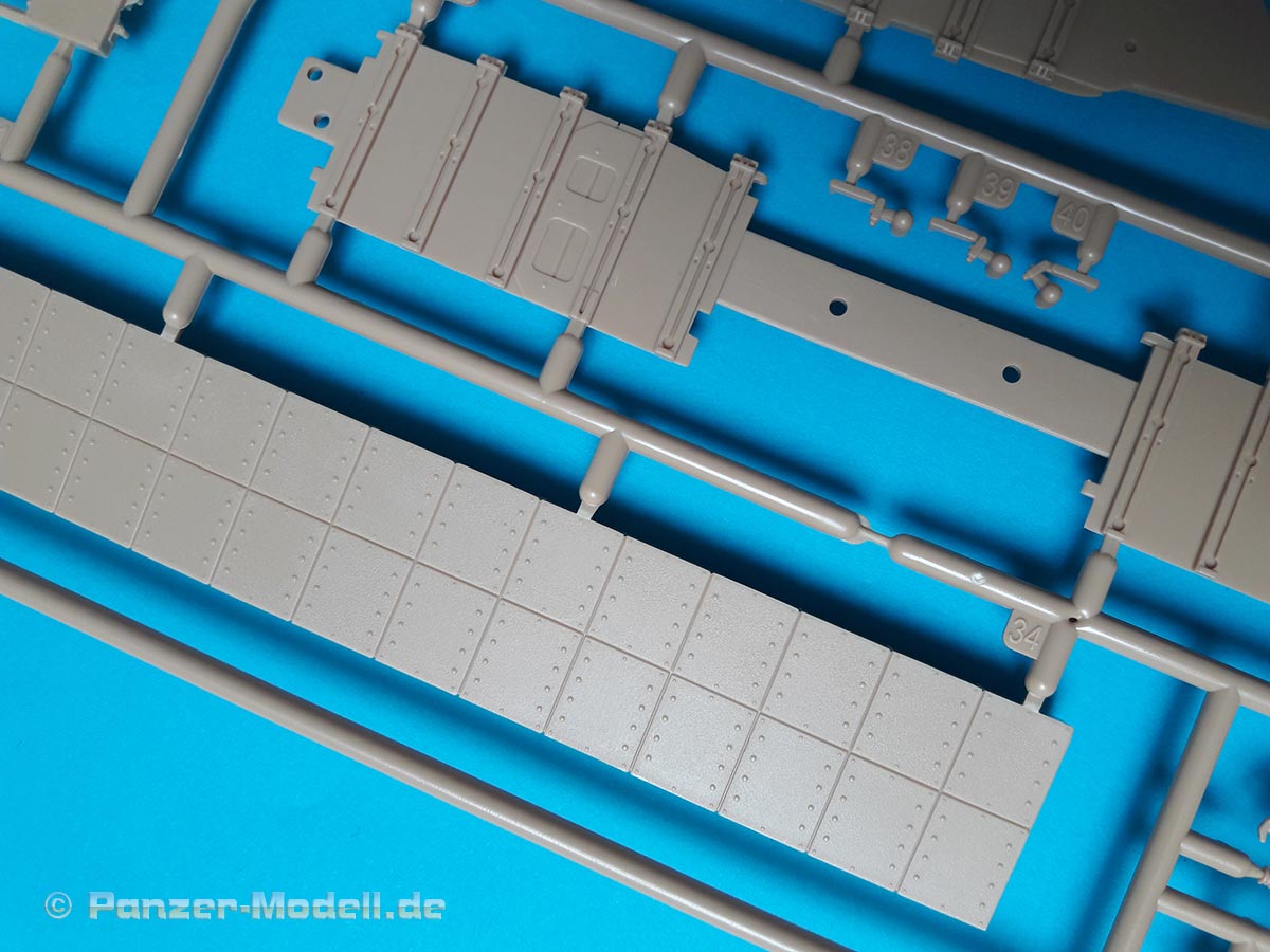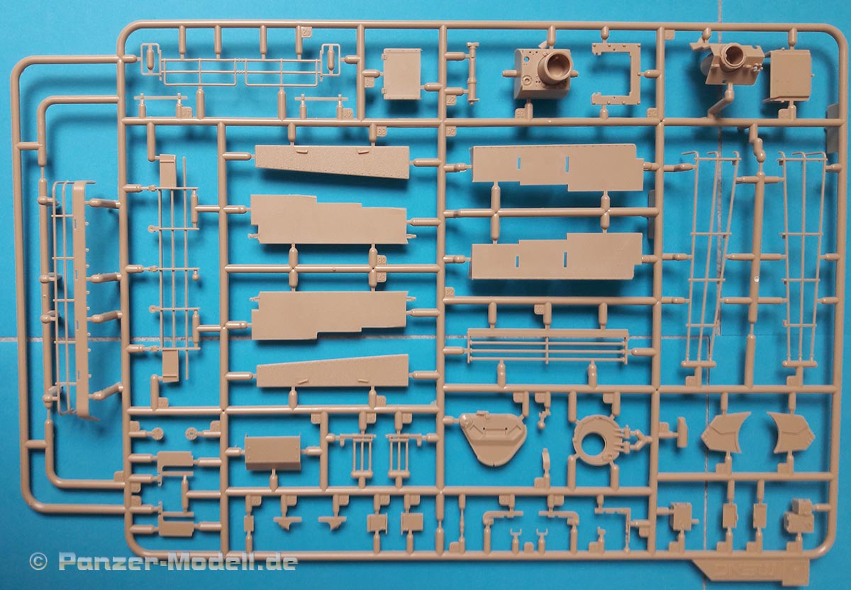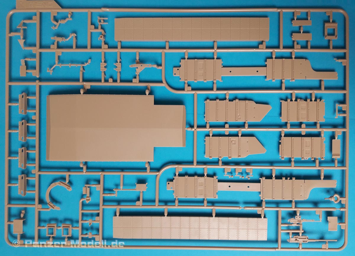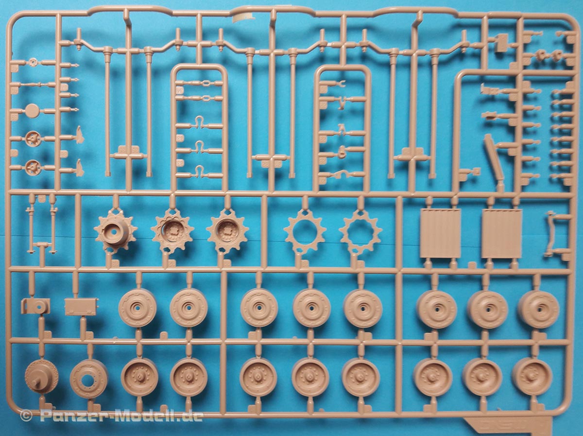 Beim Öffnen des Kartons finden sich zehn Gussäste in beigen Plastik, eine separate Unterwanne in derselben Farbe, drei Gussäste in klarem Plastik, drei Gussäste in schwarzem Plastik für die Einzelkettenglieder zwei kleine Platinen mit Ätzteilen, Polycaps, Decals, ein DIN A4 Faltblatt mit Markierungsvorschlägen und die Bauanleitung.