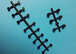 Die T-158 Ketten befinden sich an drei Gussästen an jeweils sechs Mittelstegen mit angegossen Endverbindern werden zunächst die Führungszähne geklebt, dann unter Zuhilfenahme einer Schablone die unteren Trackpads und anschließend die oberen aufgeklebt. Dies muss dann für jede Seite 14mal wiederholt werden. Dies ist zwar aufwändig, aber wenn man hier vorsichtig arbeitet, bleibt die Kette beweglich. Zusammen mit dem im Modell vorhandenen Drehstablaufwerk und den Polycaps schafft ein im Endeffekt realistisches bewegliches Laufwerk.
