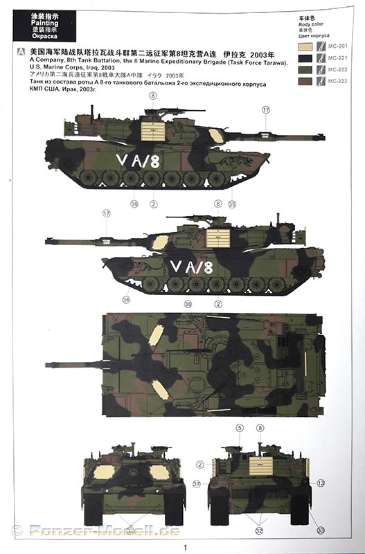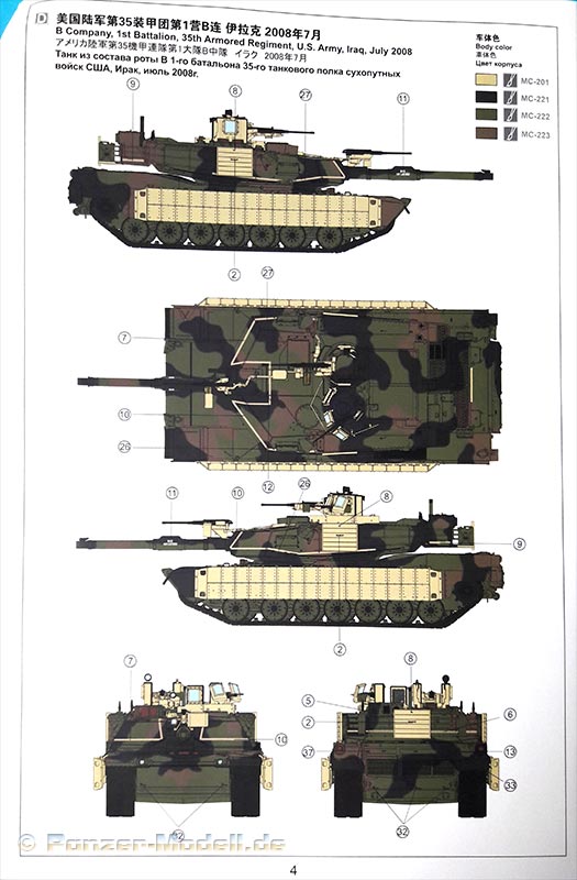 Alle Merkmale der aktuellen M1A1 scheinen am Modell umgesetzt worden zu sein. So findet sich eine schöne M256 120mm Kanone (diese ist leider zweigeteilt), der massive Turm mit Staukorb und darin enthaltener APU, die typische Auslegung der Oberwanne mit hervorragend dargestellter Anti-Rutsch-Beschichtung, die T-158 Kette, IFF Panels zur Freund-Feind Erkennung und optional der TUSK Kit.
