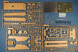 Im recht großen Stülpkarton finden wir 12 beige Spritzlinge, einen Spritzling mit Klarsichtteilen, ein Alurohr, Polycaps, verdrillten Metalldraht, zwei Platinen PE Teile und einen Decalbogen.