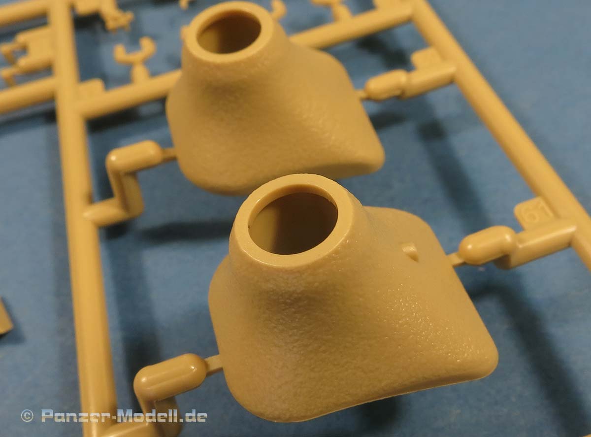 An der Frontplatte stehen für die MG Blende zwei versionen zu Verfügung. Diese Blenden sind in meinen Augen zu stark und gleichmäßig mit rauer Oberflächenstruktur versehen. Dies gilt auch oder insbesondere für die Geschützkragen der Hauptbewaffnung. Es liegen zwei verschiedene geschraubte und ein geschweißter Kragen enthalten. Die Optik der Struktur ist wirklich nicht sehr ansprechend.