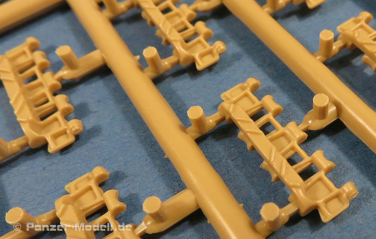 Die Kette ist ebenfalls in dem beigen Plastik gespritzt mit Einzelgliedern, die zwar nur noch mit 3 Angüssen pro Kettenglied im Spritzling sitzen, dafür aber einer davon in der Hohlkehle, der schwer zu versäubern sein dürfte. Pro Kettenglied müssen zusätzlich je zwei Kettenführungszähne eingeklebt werden. Bei 174 benötigten Kettengliedern gibt es erstmal 522 Angüsse geschnitten und versäubert werden, dazu 348 Kettenführungszähne abtrennen, versäubern und einkleben.