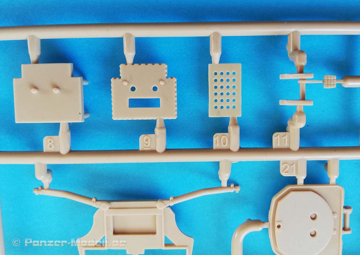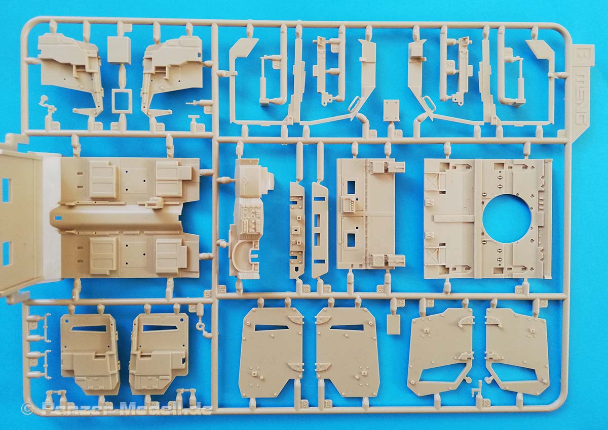 Es ist eine wahre Freude, sich diesen Bausatz anzuschauen. Die Bauteile an den einzelnen Spritzlingen sehen einfach klasse aus. Es finden sich weder Grat noch Fischhäute, und die Auswerfermarken sind alle an später nicht mehr sichtbaren Stellen versteckt. Die feine Detaillierung der einzelnen Bauteile zieht sich über den gesamten Bausatz, und beim Vergleich mit Vorbildfotos hat Meng sich hier richtig Mühe gegeben. Im Bausatz ist keine Motornachbildung enthalten, was aber zu verschmerzen ist, da für die Fahrerkabine eine komplette Inneneirichtung vorgesehen ist. Bei dieser sind die Sitze besonders hervorzuheben, da die Frontsitze mit angegossenen Gurten dargestellt sind und auch der komplette Verstellmechanismus ist vorhanden (natürlich NICHT funktionsfähig). Die hinteren Sitze sind die typischen Hängesitze von minensicheren Fahrzeugen ein klasse Feature. Auch wird der Innenraum von einer Vielzahl kleiner Details belebt, wie zum Beispiel Feuerlöscher, Funkgeräte und Stauregalen. Auch werden hier die meisten der notwendigen Fotoätzteile verbaut. Dazu kommen noch eine Menge Decals, welche im Innenraum angebracht werden. Die doppelte Panzerung wird in der Fahrerkabine montiert und ergibt ein sehr realistisches Bild. Wenn die Türen geöffnet dargestellt werden (was ohne Probleme möglich ist, allerdings ohne Umbaumaßnahmen rein statisch) bleibt der Blick auf die ganze Pracht frei Daumen hoch hierfür. Auch das Fahrzeugäußere weist auf ganzer Linie zu überzeugen hier zeigt sich eine Vielzahl von äußerst schönen Bauteilen und fein ausgeführten Einzelheiten. Der komplett ausgestattete Maschinengewehrturm ist hierfür ein gutes Beispiel, wie mit relativ wenigen Bauteilen eine schöne Wirkung erzielt wird. Des Weiteren finden sich zahlreiche Antennen, sehr gut ausgeführte Trittbretter, ein Kabelschneider und eine gut ausgestattete Ladefläche mit Regalen, welche mit Kisten und Kanistern als Ladegut befüllt werden. Die beiliegenden Vinylreifen zeigen ein tolles Profil und sehr filigrane Beschriftungen auf den Reifenflanken. Wem diese Form der Reifen nicht gefällt, kann im Aftermarket Bereich fündig werden und auf Alternativen aus Resin zurückgreifen. Die Meng typische vorbildliche Bauanleitung führt in dreiunddreißig klaren und übersichtlichen Schritten zum fertigen Modell. Die Decal Optionen erlauben die Darstellung eines Fahrzeuges in Desert Tan leider ohne Einheitenbezeichnung oder Einsatzort. Jedoch sind auf dem Decalbogen vier verschiedene Kennzeichen zu sehen. Hier sind dann eigene Referenzen gefragt. Schade das keine Version in NATO Green abgebildet ist, wie sie zum Beispiel bei „Trident Juncture“ 2018 zu sehen war. Der Decalbogen ist sehr umfangreich, was auch den Sicherheitshinweisen an modernen Fahrzeugen geschuldet ist. Die Farbangaben beziehen sich auf die Produktlinie von AK-Interactive und den (ebenfalls von AK hergestellten) Meng Farben. Allerdings können natürlich alle passenden Farben der gängigen Hersteller genutzt werden. Mein Fazit: Eine absolute Kaufempfehlung ein im Endeffekt kompakter aber sehr detaillierter Bausatz, der viel Bastelspaß verspricht. Und dabei noch Cool aussieht Insgesamt ein netter Bausatz mit schönen Details und interessanten Ansatzpunkten für den Bau, für Anfänger nur bedingt geeignet.Danke für das Besprechungsmuster an: