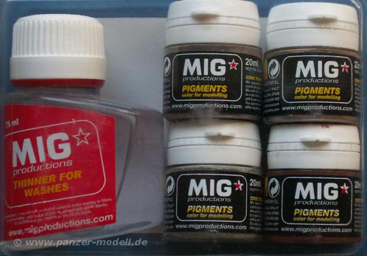 Im Set enthalten ist ein Döschen P026 - Concrete (Betonstaub), P230 - old Rust (alter Rost), P232 - dry mud (trockener Schlamm) und P234 - rubbel dust (Trümmerstaub). Dazu das angesprochene Fläschchen mit Verdünner.
