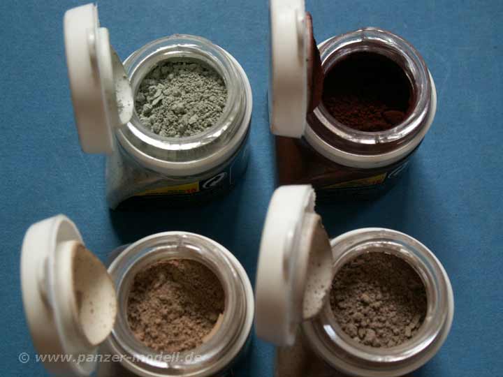 Die Pigmente sind sehr fein und von schöber farblicher Qualität. Diese können sowohl auf Fahrzeuge als auch auf Häuser und Dioramenteile aufgebracht werden, die z.B. in Trümmern liegen (Beton und Trümmerstaub). Der trockene Schlamm und Rost sind Farben, die man fast immer gut gebrauchen kann. Dabei werden die Pigmente entweder trocken auf die Oberflächen per Pinsel aufgetupft, oder können in dem Verdünner gelöst werden und dann per Pinsel aufgerbacht werden, was die Möglichkeit ergibt z.B. Schlamm in dickeren Schichten darzustellen.