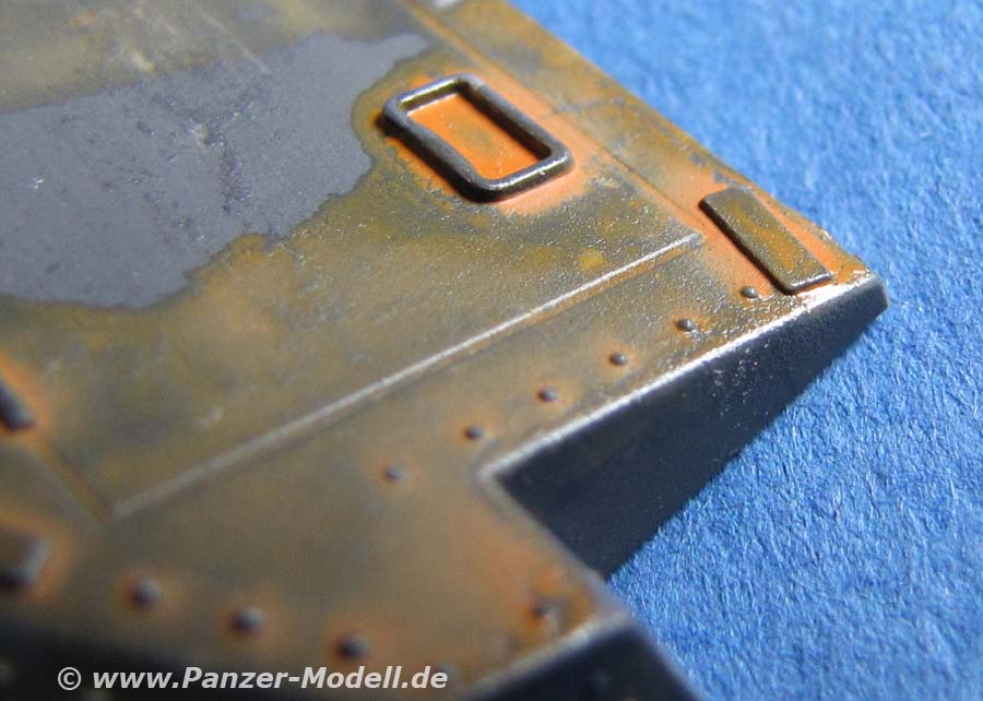 Im 75ml Plastikfläschchen ist eine hellbraune/orange Rostbrühe, die mittels Pinsel einfach auf das Modell gepinselt wird und beim Torcknen Rostschlieren in hellen Tönen entwickelt. Den vollen Umfang für realistische Rosteffekte wird man aber nur über mehrere unterschiedlich starke Anwendungen bekommen, ggf. auch mit der standard Rust Brühe.