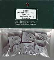 Egal ob es sich beim BMP 1 oder 2 nun um den Modellbausatz von Dragon, Revell, Zvezda oder von wem auch immer handelt sind die Laufrollen der Basismodelle grundsätzlich falsch dargestellt. Alle Hersteller haben sich nämlich der selben Gussformen bedient und bieten daher Laufrollen mit einem zu großen Durchmesser, einer viel zu stark ausfallenden Felgenkante, viel zu tiefen Sicken im Felgenkörper und einer nicht detailliert dargestellten Felgenrückseite. Da ist wirklich alles falsch was nur falsch zu machen ist. Über die restlichen Fehler der Basismodelle will ich mich nicht auslassen, die strotzen nur so vor weiteren Mängeln. Wer sich nun aber einen BMP unter Verwendung von Zubehör- oder Umbausätzen von Kleinserienherstellern, wie beispielsweise SP Designs, bauen möchte ist mit dem Laufrollenset von Miniarm gut beraten. Korrekter Durchmesser, korrekte Felgenkante, korrekte Details und eine hervorragende Gussqualität machen dieses Set zu einem MUSS! Enthalten sind 12 Laufrollen, die zwar alle über einen großen Anguss verfügen, dennoch sind sie sehr einfach zu bearbeiten. Ich habe bei meinem Set mit dem Cuttermesser entlang der Felge geritzt und so eine Sollbruchstelle geschaffen. Nun konnte der Anguss ganz leicht abgeknickt werden. Die Reste wurden mit dem Cutter abgeschabt und anschließend wurde die Laufrolle mit Schleifpapier geglättet. Für die zwölf Laufrollen habe ich nur knappe 20 Minuten gebraucht bis sie vom Anguss getrennt und versäubert waren. Das Set kostet 13,95 EUR und stellt eine willkommene Ergänzung für den Modellbausatz dar.