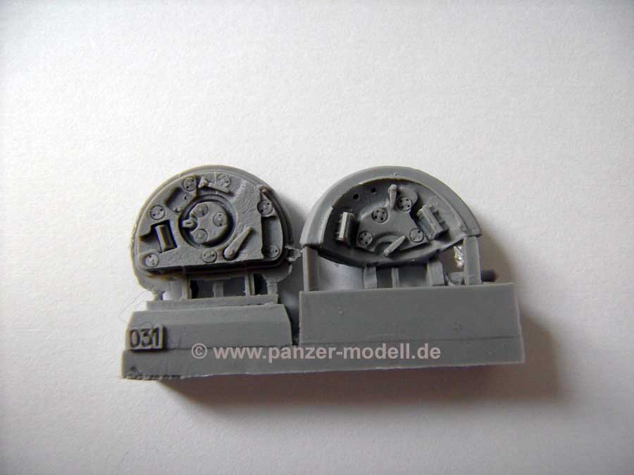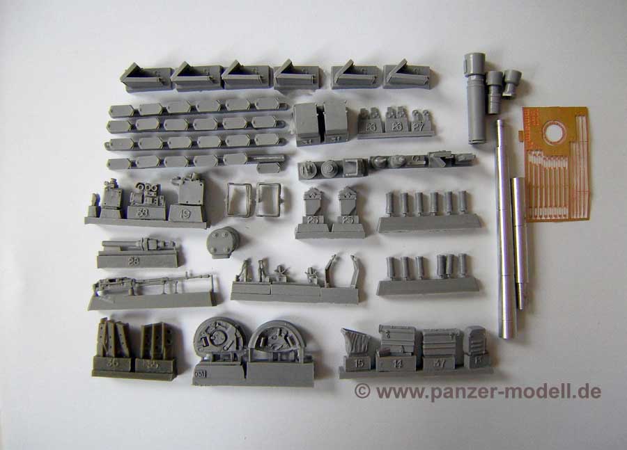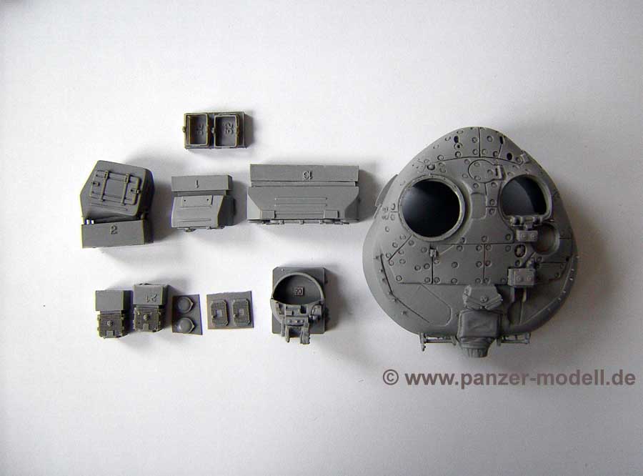 Als Basismodell dient hier der Tamiya T72M1 mit der Art.Nr. 35160. Der Umbausatz beinhaltet eine Vielzahl an Bauteilen aus hellgrauen Resin in hervorragender Gussqualität, dazu ein Alu- Kanonenrohr und eine kleine Platine mit Fotoätzteilen. Dazu gibt es noch einen kompletten neuen Turmkörper mit korrekter Formgebung und Abmessungen. Die einzelnen Bauteile sind am Anguss mit Nummern gekennzeichnet, die Bauanleitung besteht aus einem doppelseitige bedruckten DIN A4-Blatt und zeigt das gebaute Modell in verschiedenen Blickwinkeln. Die zu verwendenden Bauteile sind jeweils mit der Bauteilnummer versehen. Das Ganze wirkt übersichtlich und sehr ordentlich ausgeführt. Ich nehme nicht an dass bei Bau des Modells Probleme auftauchen werden. Der Detailreichtum ist wirklich grandios. So sind beispielsweise die Turmluken mit einem „Innenleben“ versehen und einige Bauteile für die Turminneneinrichtung sind ebenfalls vorhanden. Insgesamt ein sehr schöner und vor allem hochwertiger Umbausatz, der allerdings auch seinen Preis hat. Knappe 43,- EUR legt der geneigte Modellbauer hierfür auf den Tisch. Qualität hat nun mal seinen Preis. Der gesamte Bausatzinhalt ist sehr umfangreich und richtet sich eher an den erfahrenen Modellbauer.